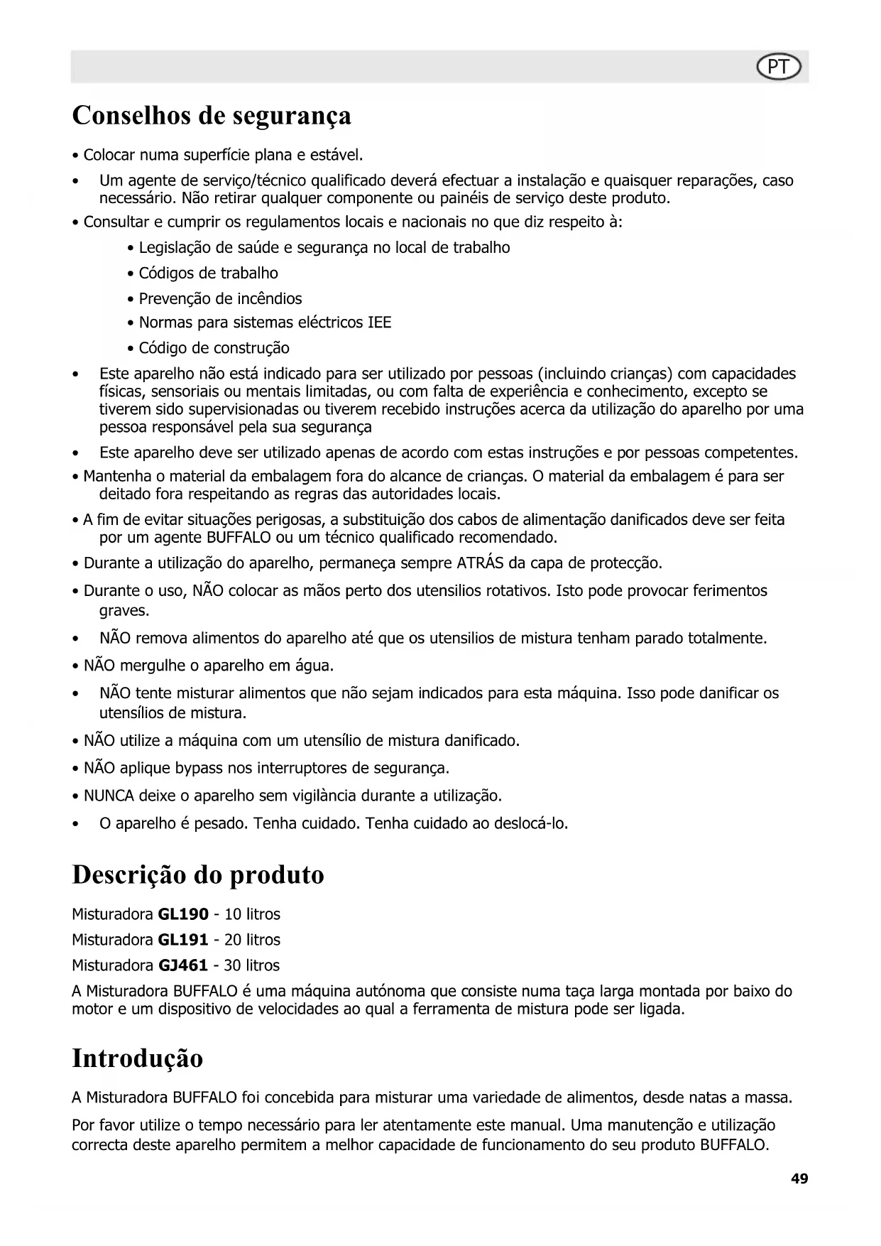 - O aparelho é pesado. Tenha cuidado. Tenha cuidado ao deslocá-lo. Descrição do produto Misturadora GL190 - 10 litros Misturadora GL191 - 20 litros Misturadora GJ461 - 30 litros A Misturadora BUFFALO é uma máquina autónoma que consiste numa taça larga montada por baixo do motor e um dispositivo de velocidades ao qual a ferramenta de mistura pode ser ligada. Introdução A Misturadora BUFFALO foi concebida para misturar uma variedade de alimentos, desde natas a massa. Por favor utilize o tempo necessário para ler atentamente este manual. Uma manutenção e utilização correcta deste aparelho permitem a melhor capacidade de funcionamento do seu produto BUFFALO.50