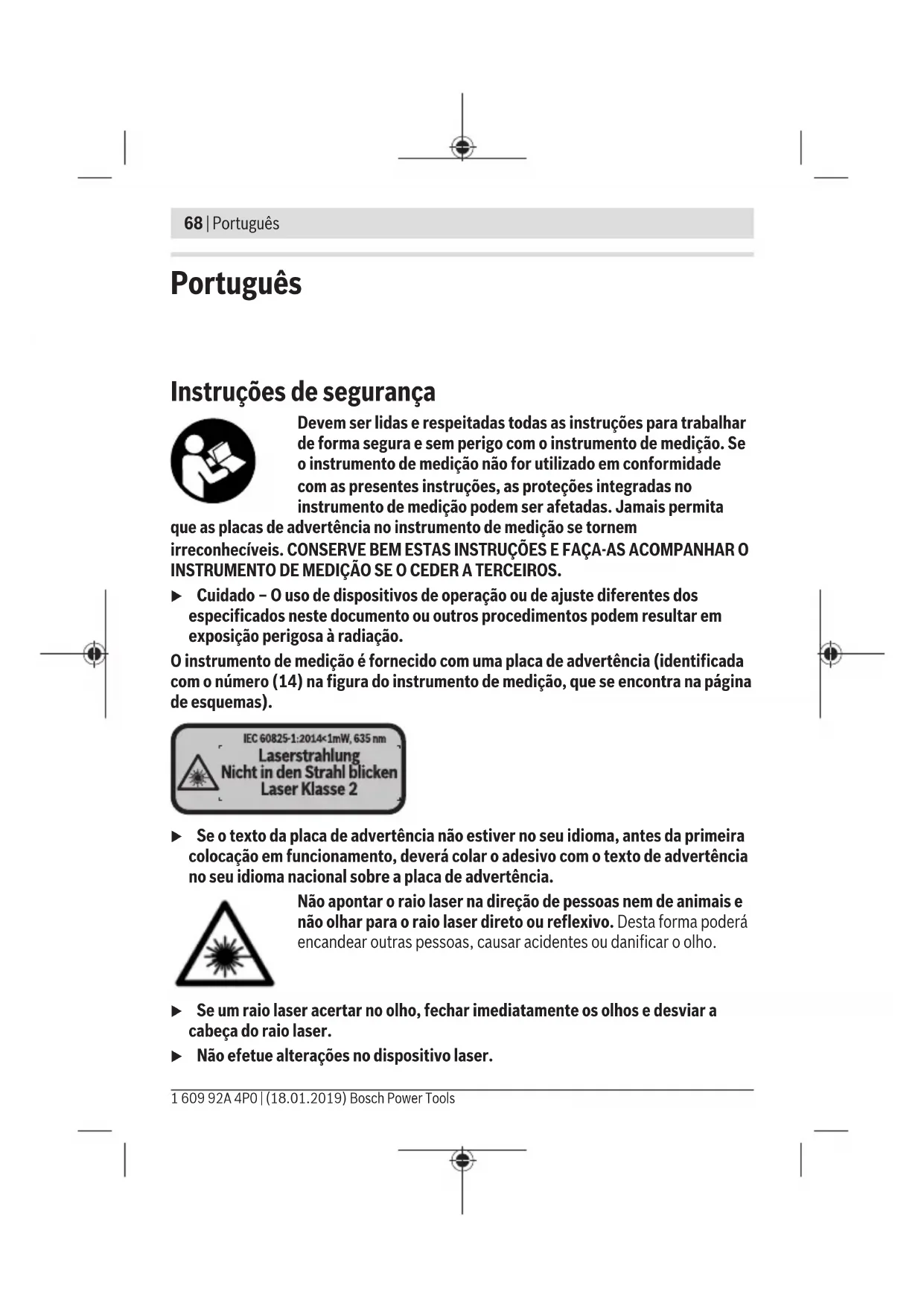 Dividir o cálculo em passos intermediários Resultado da medição não fiável A superfície alvo não reflete claramente (p.ex. água, vidro). Cobrir a superfície alvo A saída do raio laser (13) ou da lente recetora (12) está tapada. Manter a saída do raio laser (13) ou da lente recetora (12) desobstruída Resultado da medição implausível Foi ajustado um nível de referência errado Selecionar um nível de referência adequado para a medição Obstáculo no caminho do raio laser O ponto de laser deve estar deitado completamente sobre a superfície alvo. Bluetooth® não pode ser ativado As pilhas ou baterias estão fracas. Substituir pilhas ou baterias Sem ligação Bluetooth® Ligação Bluetooth® com interferências Desligue e volte a ligar o Bluetooth®. Verifique a aplicação no seu aparelho terminal móvel. Verifique se o Bluetooth® está ativado no seu instrumento de medição e aparelho terminal móvel. Verifique se o seu aparelho terminal móvel se encontra sobrecarregado. Reduza a distância entre o instrumento de medição e o seu aparelho terminal móvel. Evite obstáculos (p.ex. betão armado, portas metálicas) entre o instrumento de medição e o seu aparelho terminal móvel. Mantenha-se afastado de fontes de 1 609 92A 4P0 | (18.01.2019) Bosch Power ToolsPortuguês | 81 Causa Solução interferência eletromagnética (p.ex. emissores WLAN). O instrumento de medição controla o funcionamento correto em cada medição. Se for detetado algum defeito, o mostrador mostra apenas o símbolo ao lado. Neste caso, ou quando não for possível eliminar um erro mesmo tomando as medidas auxiliares supramencionadas, envie o instrumento de medição para o Serviço de Assistência Técnica da Bosch por intermédio do seu agente autorizado. Controlo de exatidão do instrumento de medição Pode verificar a exatidão do instrumento de medição da seguinte maneira: – Selecione um trajeto de medição que não se altere ao longo do tempo com um comprimento aprox. de 3 a 10m, cujo valor saiba exatamente qual é (p.ex. largura da divisão, abertura da porta). O trajeto de medição deve encontrar-se no interior e a área alvo da medição deve ser lisa e com boas capacidades de reflexão. – Meça o trajeto 10 vezes de seguida. A diferença entre as medições individuais do valor médio não deve ultrapassar os ±2mm. Registe as medições para, posteriormente, poder comparar a exatidão. Manutenção e assistência técnica Manutenção e limpeza Armazene e transporte o instrumento de medição apenas na bolsa de proteção fornecida. Manter o instrumento de medição sempre limpo. Não mergulhar o instrumento de medição na água ou em outros líquidos. Limpar sujidades com um pano húmido e macio. Não utilize detergentes ou solventes. Limpe especialmente a lente recetora (12) com o mesmo cuidado com que têm de ser manuseados óculos ou a lente de uma máquina fotográfica. Envie o instrumento de medição em caso de reparação na bolsa de proteção (17). Serviço pós-venda e aconselhamento O serviço pós-venda responde às suas perguntas a respeito de serviços de reparação e de manutenção do seu produto, assim como das peças de substituição. Desenhos explodidos e informações acerca das peças de substituição também em: www.bosch- pt.com Bosch Power Tools 1 609 92A 4P0 | (18.01.2019)82 | Português A nossa equipa de consultores Bosch esclarece com prazer todas as suas dúvidas a respeito dos nossos produtos e acessórios. Indique para todas as questões e encomendas de peças sobressalentes impreterivelmente a referência de 10 dígitos de acordo com a placa de características do produto. Portugal Robert Bosch LDA Avenida Infante D. Henrique Lotes 2E – 3E 1800 Lisboa Para efetuar o seu pedido online de peças entre na página www.ferramentasbosch.com. Tel.: 21 8500000 Fax: 21 8511096 Brasil Robert Bosch Ltda. – Divisão de Ferramentas Elétricas Caixa postal 1195 – CEP: 13065-900 Campinas – SP Tel.: 0800 7045 446 www.bosch.com.br/contato Eliminação Os instrumentos de medição, baterias/pilhas, acessórios e embalagens devem ser enviados a uma reciclagem ecológica de matéria-prima. Não deite o instrumento de medição e as baterias/pilhas no lixo doméstico! Apenas para países da UE: Conforme a Diretiva Europeia 2012/19/UE relativa aos resíduos de instrumentos de medição europeias 2006/66/CE é necessário recolher separadamente as baterias/as pilhas defeituosas ou gastas e encaminhá-las para uma reciclagem ecológica. 1 609 92A 4P0 | (18.01.2019) Bosch Power ToolsItaliano | 83 Italiano Avvertenze di sicurezza Leggere e osservare tutte le avvertenze e le istruzioni, per lavo- rare con lo strumento di misura in modo sicuro e senza pericoli. Se lo strumento di misura non viene utilizzato conformemente al- le presenti istruzioni, ciò può pregiudicare i dispositivi di prote- zione integrati nello strumento stesso. Non rendere mai illeggibi- li le targhette di avvertenza applicate sullo strumento di misura. CONSERVARE CON CURA LE PRESENTI ISTRUZIONI E CONSEGNARLE INSIEME ALLO STRUMENTO DI MISURA IN CASO DI CESSIONE A TERZI. u Prudenza – Qualora vengano utilizzati dispositivi di comando o regolazione di- versi da quelli qui indicati o vengano eseguite procedure diverse, sussiste la pos- sibilità di una pericolosa esposizione alle radiazioni. Lo strumento di misura viene fornito con una targhetta di pericolo(contrassegnata con il numero (14) nella figura dello strumento stesso, alla pagina con rappresenta- zione grafica). u Se il testo della targhetta di pericolo è in una lingua straniera, prima della messa in funzione iniziale incollare l’etichetta fornita in dotazione, con il testo nella pro- pria lingua. Non dirigere mai il raggio laser verso persone oppure animali e non guardare il raggio laser né diretto, né riflesso. Il raggio laser potrebbe abbagliare le persone, provocare incidenti o danneggiare gli occhi. u Se un raggio las