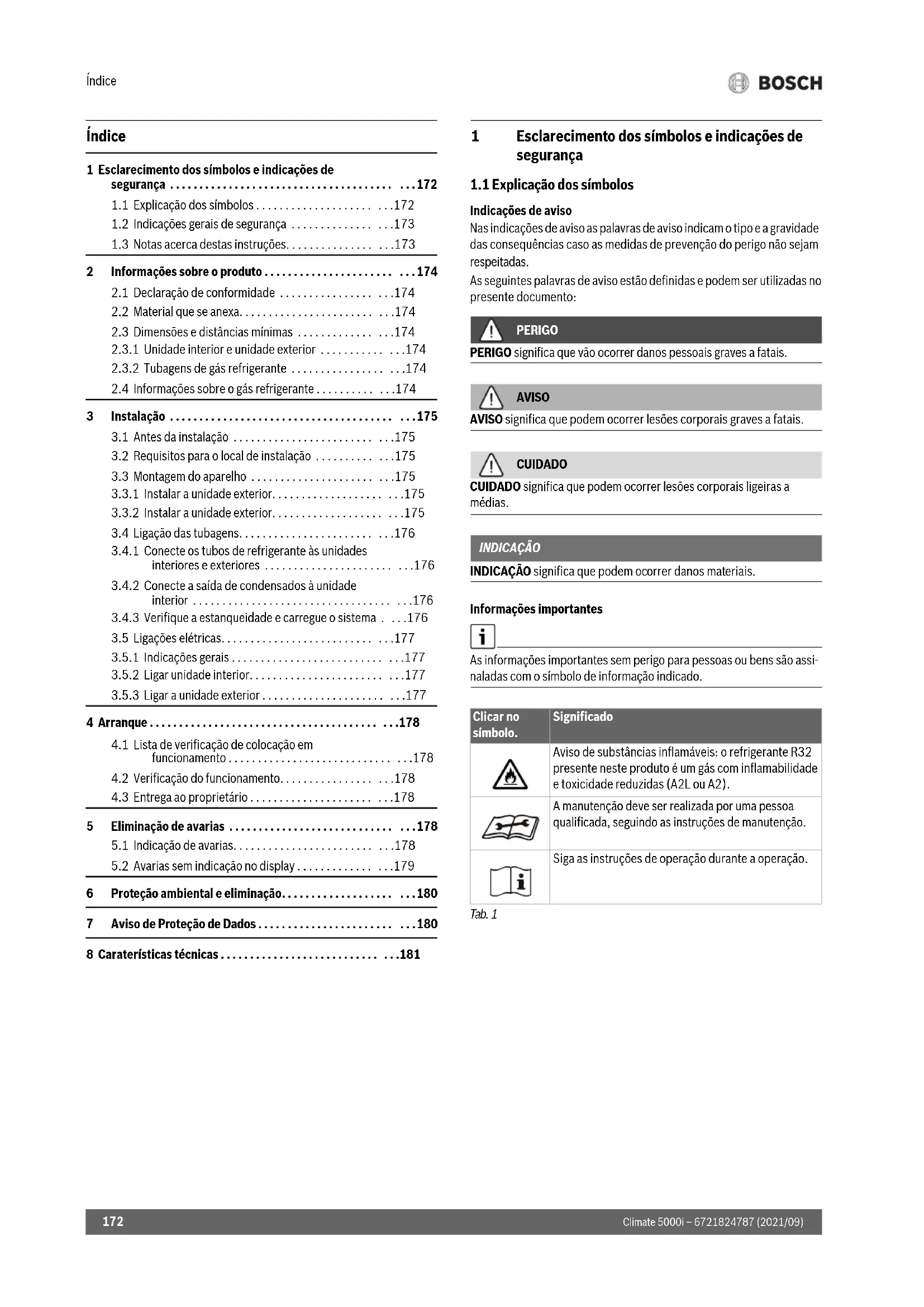 6 Proteção ambiental e eliminação. . . . . . . . . . . . . . . . . . . . . .180 7 Aviso de Proteção de Dados . . . . . . . . . . . . . . . . . . . . . . . . . .180 8 Caraterísticas técnicas . . . . . . . . . . . . . . . . . . . . . . . . . . . . . .181 Clicar no símbolo. Significado Aviso de substâncias inflamáveis: o refrigerante R32 presente neste produto é um gás com inflamabilidade e toxicidade reduzidas (A2L ou A2). A manutenção deve ser realizada por uma pessoa qualificada, seguindo as instruções de manutenção. Siga as instruções de operação durante a operação.Esclarecimento dos símbolos e indicações de segurança