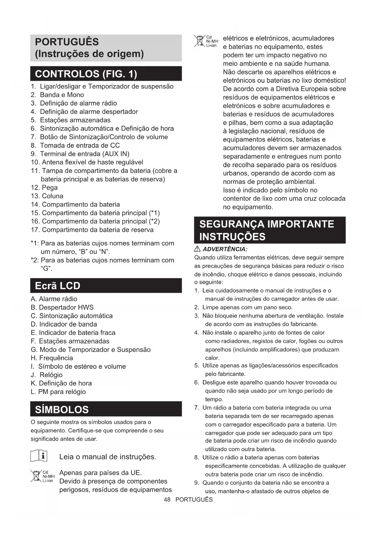 J. Relógio K. Definição de hora L. PM para relógio SÍMBOLOS O seguinte mostra os símbolos usados para o equipamento. Certifique-se que compreende o seu significado antes de usar. Leia o manual de instruções. Apenas para países da UE. Devido à presença de componentes perigosos, resíduos de equipamentos elétricos e eletrónicos, acumuladores e baterias no equipamento, estes podem ter um impacto negativo no meio ambiente e na saúde humana. Não descarte os aparelhos elétricos e eletrónicos ou baterias no lixo doméstico! De acordo com a Diretiva Europeia sobre resíduos de equipamentos elétricos e eletrónicos e sobre acumuladores e baterias e resíduos de acumuladores e pilhas, bem como a sua adaptação à legislação nacional, resíduos de equipamentos elétricos, baterias e acumuladores devem ser armazenados separadamente e entregues num ponto de recolha separado para os resíduos urbanos, operando de acordo com as normas de proteção ambiental. Isso é indicado pelo símbolo no contentor de lixo com uma cruz colocada no equipamento.