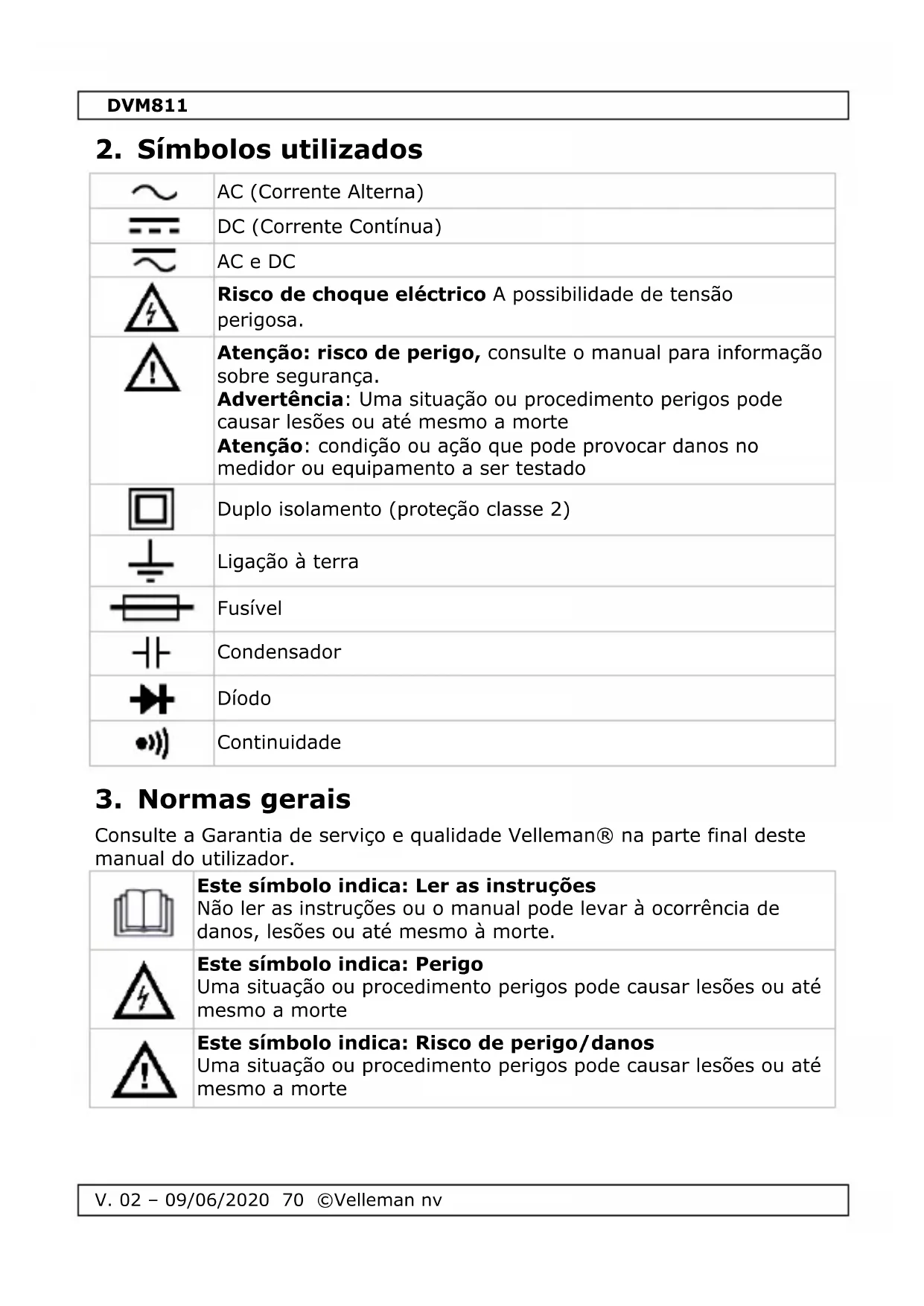 Este símbolo indica: Risco de perigo/danos Uma situação ou procedimento perigos pode causar lesões ou até mesmo a morteDVM811