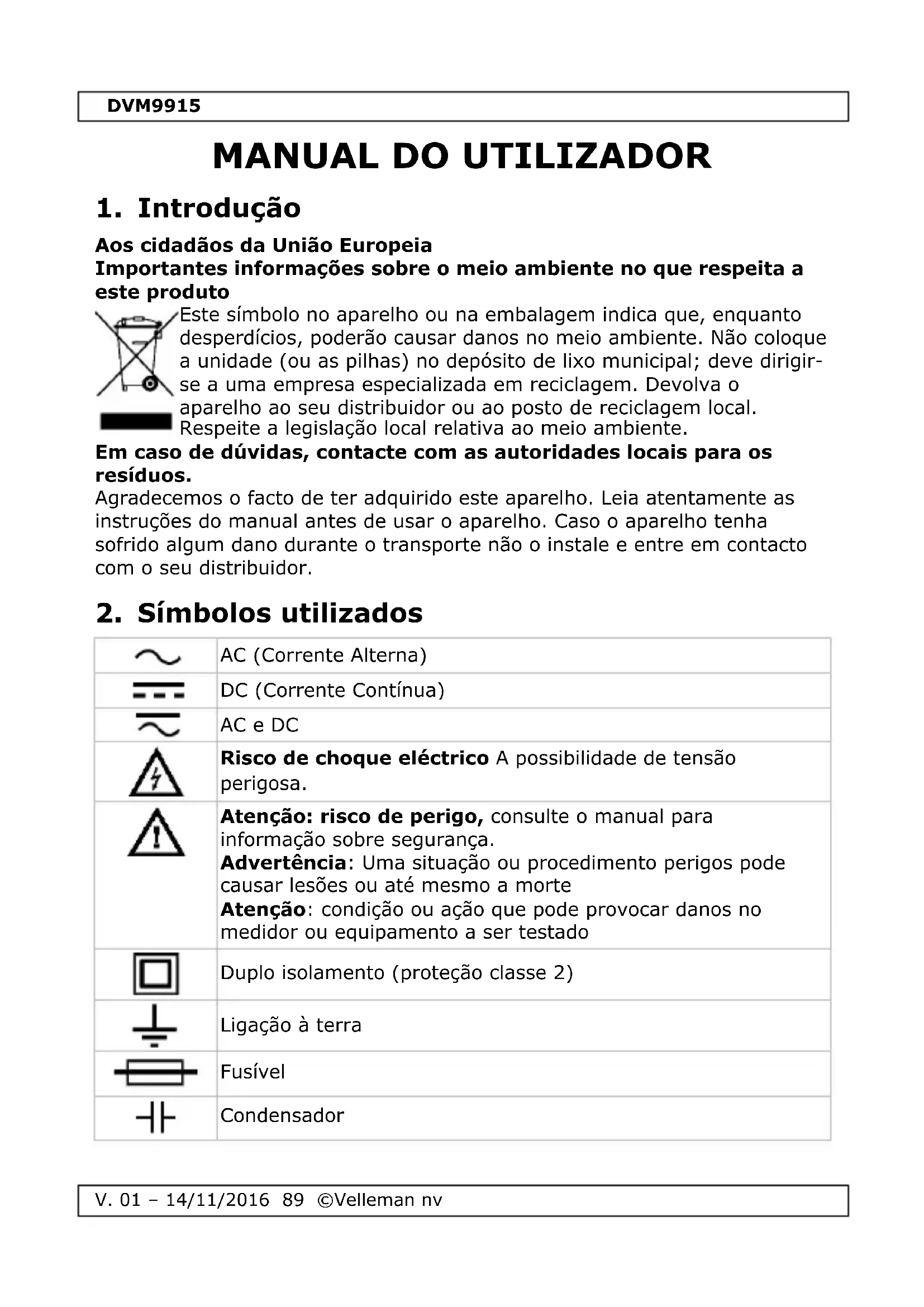 Encontre gratuitamente o manual do aparelho DVM9915 VELLEMAN em formato PDF.