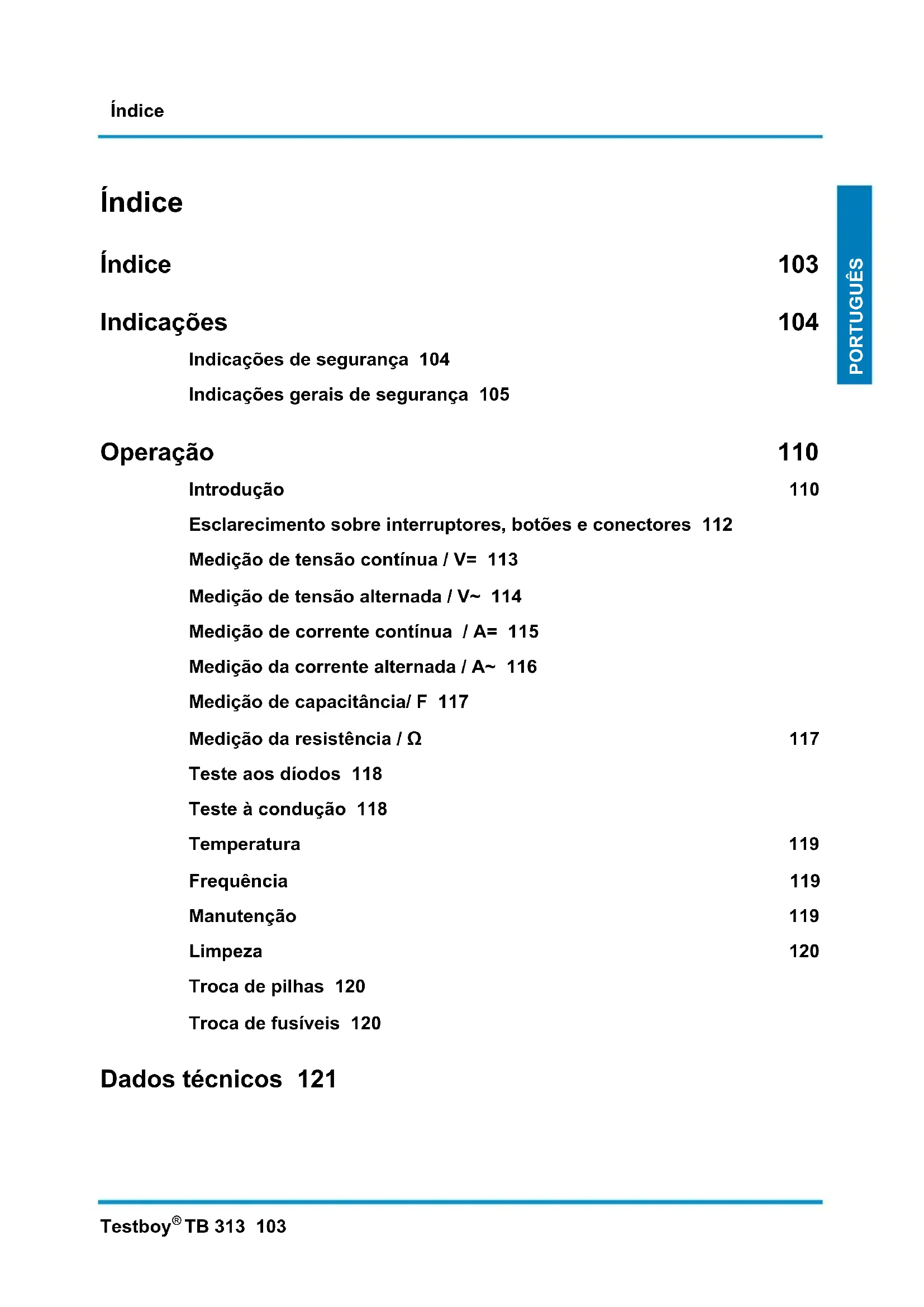 TB 313 103 PORTUGUÊS Índice Índice 103 Indicações 104 Indicações de segurança 104 Indicações gerais de segurança 105 Operação 110 Introdução 110 Esclarecimento sobre interruptores, botões e conectores 112 Medição de tensão contínua / V= 113 Medição de tensão alternada / V~ 114 Medição de corrente contínua / A= 115 Medição da corrente alternada / A~ 116 Medição de capacitância/ F 117 Medição da resistência / Ω 117 Teste aos díodos 118 Teste à condução 118 Temperatura 119 Frequência 119 Manutenção 119 Limpeza 120 Troca de pilhas 120 Troca de fusíveis 120 Dados técnicos 121Indicações 104 Testboy