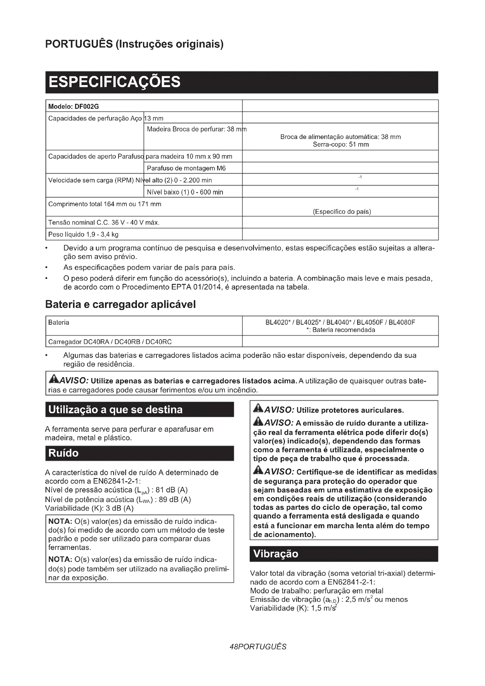 - O peso poderá diferir em função do acessório(s), incluindo a bateria. A combinação mais leve e mais pesada, de acordo com o Procedimento EPTA 01/2014, é apresentada na tabela. Bateria e carregador aplicável Bateria BL4020* / BL4025* / BL4040* / BL4050F / BL4080F *: Bateria recomendada Carregador DC40RA / DC40RB / DC40RC
