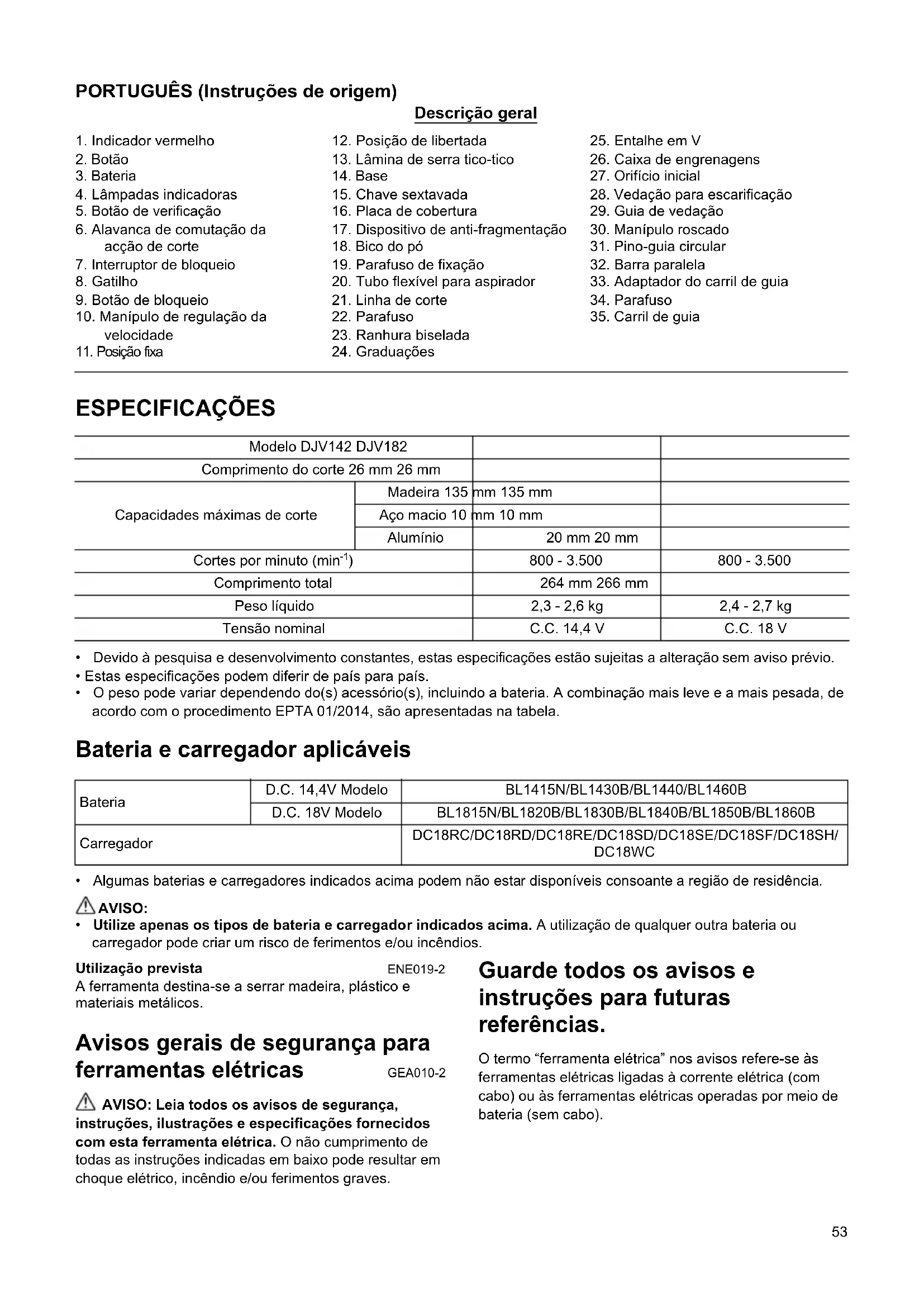 - Utilize apenas os tipos de bateria e carregador indicados acima. A utilização de qualquer outra bateria ou carregador pode criar um risco de ferimentos e/ou incêndios. Utilização prevista ENE019-2 A ferramenta destina-se a serrar madeira, plástico e materiais metálicos. Avisos gerais de segurança para ferramentas elétricas GEA010-2 AVISO: Leia todos os avisos de segurança, instruções, ilustrações e especificações fornecidos com esta ferramenta elétrica. O não cumprimento de todas as instruções indicadas em baixo pode resultar em choque elétrico, incêndio e/ou ferimentos graves. Guarde todos os avisos e instruções para futuras referências. O termo “ferramenta elétrica” nos avisos refere-se às ferramentas elétricas ligadas à corrente elétrica (com cabo) ou às ferramentas elétricas operadas por meio de bateria (sem cabo).