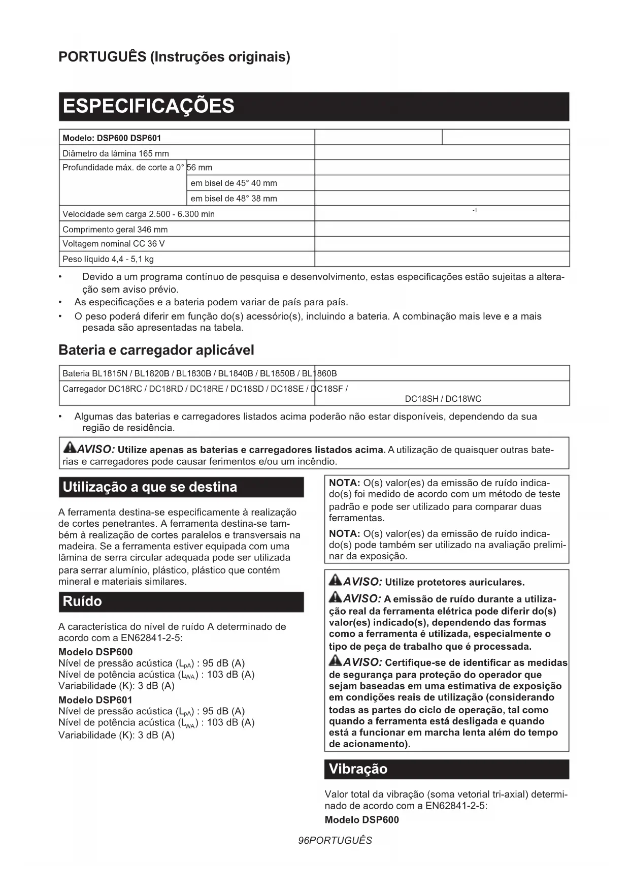 - Algumasdasbateriasecarregadoreslistadosacimapoderãonãoestardisponíveis,dependendodasua regiãoderesidência. AVISO: Utilize apenas as baterias e carregadores listados acima.Autilizaçãodequaisqueroutrasbate- riasecarregadorespodecausarferimentose/ouumincêndio. Utilização a que se destina Aferramentadestina-seespecicamenteàrealização decortespenetrantes.Aferramentadestina-setam- bémàrealizaçãodecortesparalelosetransversaisna madeira. Se a ferramenta estiver equipada com uma lâminadeserracircularadequadapodeserutilizada para serrar alumínio, plástico, plástico que contém mineral e materiais similares. Ruído AcaracterísticadonívelderuídoAdeterminadode acordo com a EN62841-2-5: Modelo DSP600 Níveldepressãoacústica(L
