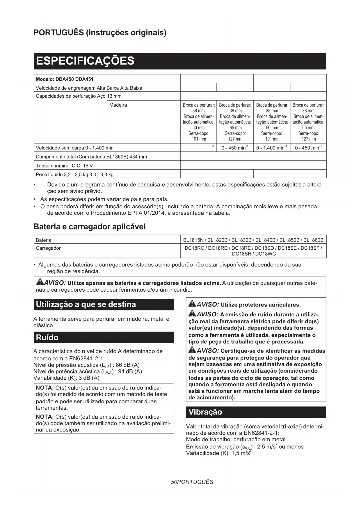 - Algumas das baterias e carregadores listados acima poderão não estar disponíveis, dependendo da sua região de residência. AVISO: Utilize apenas as baterias e carregadores listados acima. A utilização de quaisquer outras bate- rias e carregadores pode causar ferimentos e/ou um incêndio. Utilização a que se destina A ferramenta serve para perfurar em madeira, metal e plástico. Ruído A característica do nível de ruído A determinado de acordo com a EN62841-2-1: Nível de pressão acústica (L