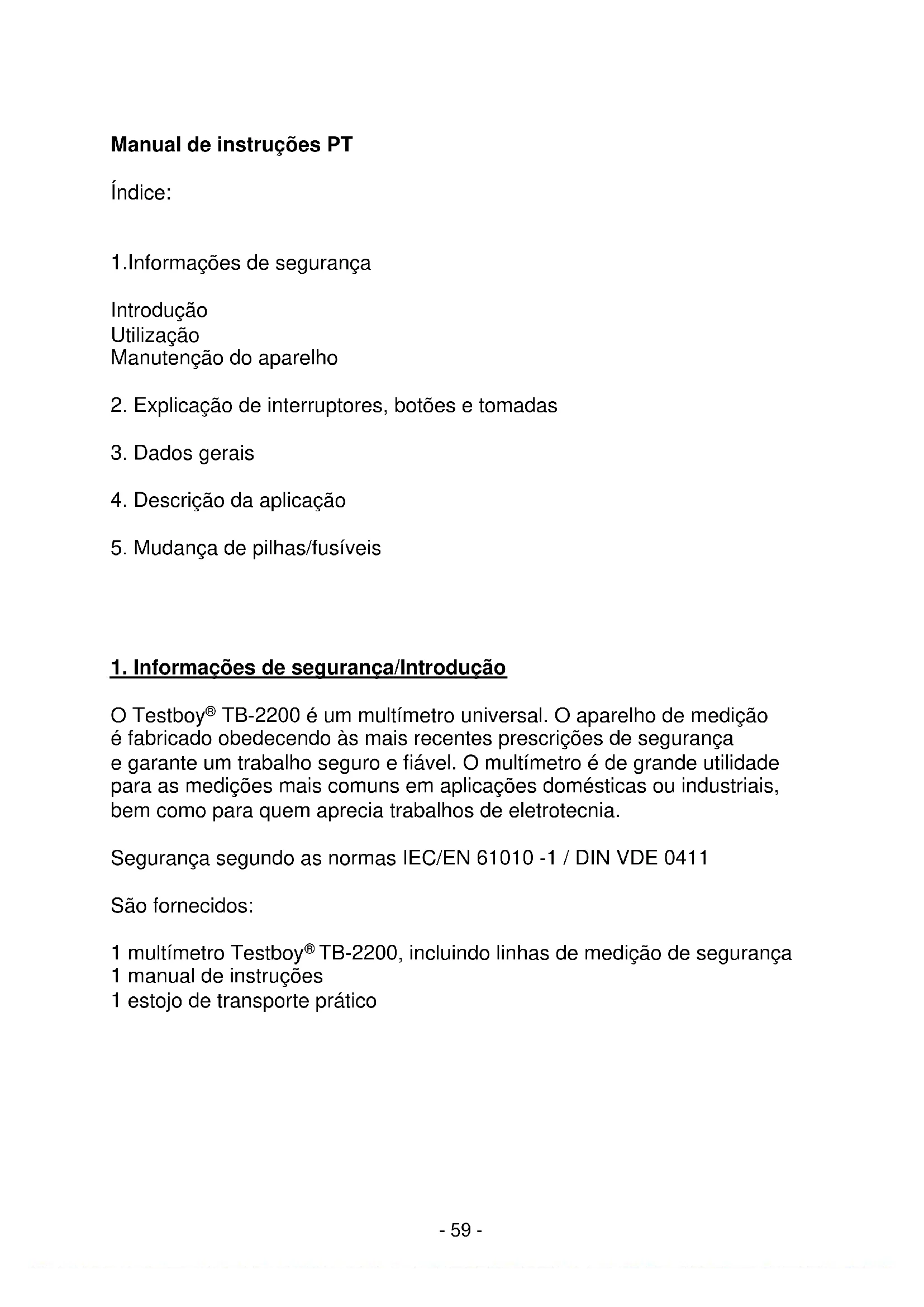 O Testboy® TB-2200 saiu da fabrica em excellentes condições tínicas de segurar. Para o manter assim, o'utilizar deve observar as indicações de segurarça destemanual.