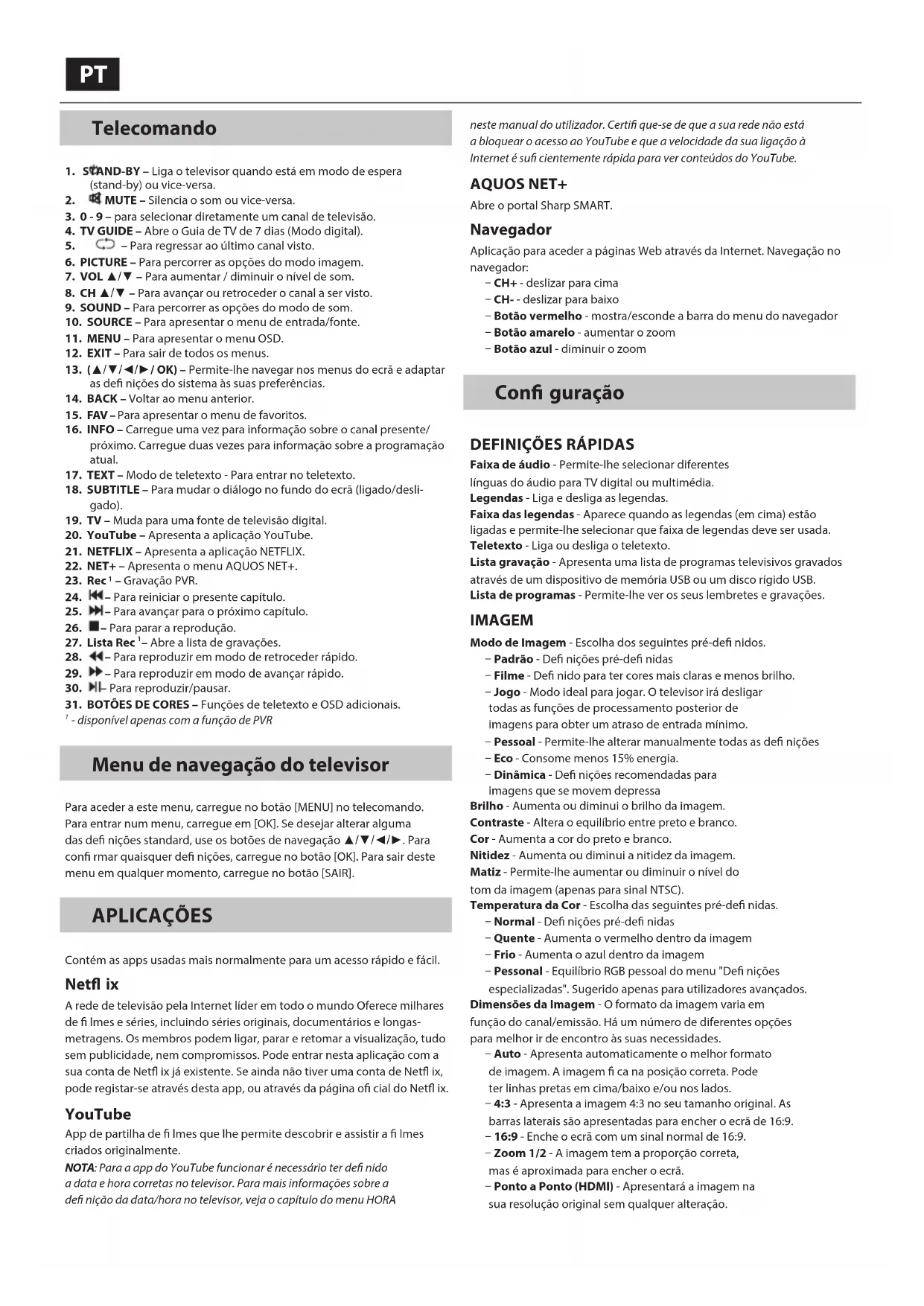 - disponível apenas com a função de PVR Menu de navegação do televisor Para aceder a este menu, carregue no botão [MENU] no telecomando. Para entrar num menu, carregue em [OK]. Se desejar alterar alguma das de nições standard, use os botões de navegação ▲/▼/◄/►. Para con rmar quaisquer de nições, carregue no botão [OK]. Para sair deste menu em qualquer momento, carregue no botão [SAIR]. APLICAÇÕES Contém as apps usadas mais normalmente para um acesso rápido e fácil. Net ix A rede de televisão pela Internet líder em todo o mundo Oferece milhares de lmes e séries, incluindo séries originais, documentários e longas- metragens. Os membros podem ligar, parar e retomar a visualização, tudo sem publicidade, nem compromissos. Pode entrar nesta aplicação com a sua conta de Net ix já existente. Se ainda não tiver uma conta de Net ix, pode registar-se através desta app, ou através da página o cial do Net ix. YouTube App de partilha de lmes que lhe permite descobrir e assistir a lmes criados originalmente. NOTA: Para a app do YouTube funcionar é necessário ter de nido a data e hora corretas no televisor. Para mais informações sobre a de nição da data/hora no televisor, veja o capítulo do menu HORA neste manual do utilizador. Certi que-se de que a sua rede não está a bloquear o acesso ao YouTube e que a velocidade da sua ligação à Internet é su cientemente rápida para ver conteúdos do YouTube. AQUOS NET+ Abre o portal Sharp SMART. Navegador Aplicação para aceder a páginas Web através da Internet. Navegação no navegador: – CH+ - deslizar para cima – CH- - deslizar para baixo – Botão vermelho - mostra/esconde a barra do menu do navegador – Botão amarelo - aumentar o zoom – Botão azul - diminuir o zoom Con guração