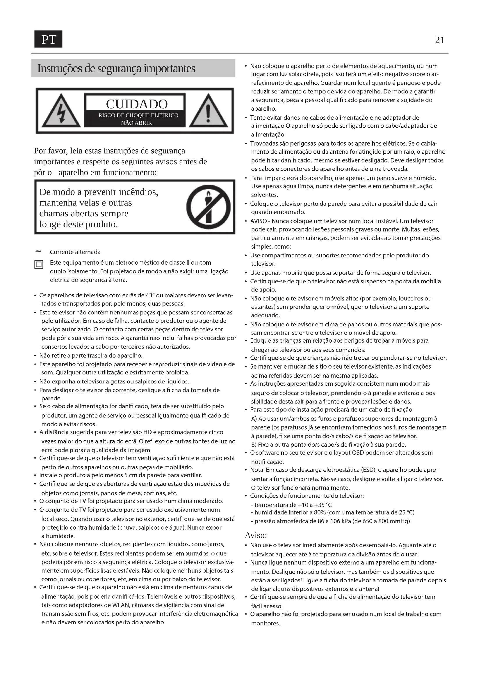 Instruções de segurança importantes CUIDADO RISCO DE CHOQUE ELÉTRICONÃO ABRIR Por favor, leia estas instruções de segurança importantes e respeite os seguintes avisos antes de pôr oaparelho em funcionamento: De modo a prevenir incêndios, mantenha velas e outras chamas abertas sempre longe deste produto. Corrente alternadaEste equipamento é um eletrodoméstico de classe II ou com duplo isolamento. Foi projetado de modo a não exigir uma ligação elétrica de segurança à terra.• Os aparelhos de televisao com ecrãs de 43” ou maiores devem ser levan-tados e transportados por, pelo menos, duas pessoas.• Este televisor não contém nenhumas peças que possam ser consertadas pelo utilizador. Em caso de falha, contacte oprodutor ou oagente de serviço autorizado. Ocontacto com certas peças dentro do televisor pode pôr asua vida em risco. Agarantia não inclui falhas provocadas por consertos levados acabo por terceiros não autorizados.• Não retire aparte traseira do aparelho.• Este aparelho foi projetado para receber e reproduzir sinais de vídeo e de som. Qualquer outra utilização é estritamente proibida.• Não exponha otelevisor agotas ou salpicos de líquidos.• Para desligar o televisor da corrente, desligue a cha da tomada de parede.• Se ocabo de alimentação for dani cado, terá de ser substituído pelo produtor, um agente de serviço ou pessoal igualmente quali cado de modo aevitar riscos.• A distância sugerida para ver televisão HD é aproximadamente cinco vezes maior do que a altura do ecrã. Ore exo de outras fontes de luz no ecrã pode piorar aqualidade da imagem.• Certi que-se de que otelevisor tem ventilação su ciente e que não está perto de outros aparelhos ou outras peças de mobiliário.• Instale oproduto apelo menos 5 cm da parede para ventilar.• Certi que-se de que as aberturas de ventilação estão desimpedidas de objetos como jornais, panos de mesa, cortinas, etc.• Oconjunto de TV foi projetado para ser usado num clima moderado.• Oconjunto de TV foi projetado para ser usado exclusivamente num local seco. Quando usar otelevisor no exterior, certi que-se de que está protegido contra humidade (chuva, salpicos de água). Nunca expor ahumidade.• Não coloque nenhuns objetos, recipientes com líquidos, como jarros, etc, sobre o televisor. Estes recipientes podem ser empurrados, oque poderia pôr em risco asegurança elétrica. Coloque otelevisor exclusiva-mente em superfícies lisas e estáveis. Não coloque nenhuns objetos tais como jornais ou cobertores, etc, em cima ou por baixo do televisor.• Certi que-se de que oaparelho não está em cima de nenhuns cabos de alimentação, pois poderia dani cá-los. Telemóveis e outros dispositivos, tais como adaptadores de WLAN, câmaras de vigilância com sinal de transmissão sem os, etc. podem provocar interferência eletromagnética e não devem ser colocados perto do aparelho.• Não coloque oaparelho perto de elementos de aquecimento, ou num lugar com luz solar direta, pois isso terá um efeito negativo sobre oar-refecimento do aparelho. Guardar num local quente é perigoso e pode reduzir seriamente otempo de vida do aparelho. De modo agarantir asegurança, peça apessoal quali cado para remover asujidade do aparelho.• Tente evitar danos no cabos de alimentação e no adaptador de alimentação Oaparelho só pode ser ligado com ocabo/adaptador de alimentação.• Trovoadas são perigosas para todos os aparelhos elétricos. Se ocabla-mento de alimentação ou da antena for atingido por um raio, oaparelho pode car dani cado, mesmo se estiver desligado. Deve desligar todos os cabos e conectores do aparelho antes de uma trovoada.• Para limpar oecrã do aparelho, use apenas um pano suave e húmido. Use apenas água limpa, nunca detergentes e em nenhuma situação solventes.• Coloque otelevisor perto da parede para evitar apossibilidade de cair quando empurrado.• AVISO - Nunca coloque um televisor num local instável. Um televisor pode cair, provocando lesões pessoais graves ou morte. Muitas lesões, particularmente em crianças, podem ser evitadas ao tomar precauções simples, como:• Use compartimentos ou suportes recomendados pelo produtor do televisor.• Use apenas mobília que possa suportar de forma segura o televisor.• Certi que-se de que o televisor não está suspenso na ponta da mobília de apoio.• Não coloque o televisor em móveis altos (por exemplo, louceiros ou estantes) sem prender quer o móvel, quer o televisor a um suporte adequado.• Não coloque o televisor em cima de panos ou outros materiais que pos-sam encontrar-se entre o televisor e o móvel de apoio.• Eduque as crianças em relação aos perigos de trepar a móveis para chegar ao televisor ou aos seus comandos.• Certi que-se de que crianças não irão trepar ou pendurar-se no televisor.• Se mantiver e mudar de sítio o seu televisor existente, as indicações acima referidas devem ser na mesma aplicadas.• As instruções apresentadas em seguida consistem num modo mais seguro de colocar otelevisor, prendendo-oà parede e evitarão apos-sibilidade desta cair para afrente e provocar lesões e danos.• Para este tipo de instalação precisará de um cabo de xação.A) Ao usar um/ambos os furos e parafusos superiores de montagem à parede (os parafusos já se encontram fornecidos nos furos de montagem à parede), xe uma ponta do/scabo/sde xação ao televisor.B) Fixe aoutra ponta do/scabo/sde xação à sua parede.• Osoftware no seu televisor e olayout OSD podem ser alterados sem noti cação.• Nota: Em caso de descarga eletroestática (ESD), o aparelho pode apre-sentar a função incorreta. Nesse caso, desligue e volte a ligar o televisor. O televisor funcionará normalmente.• Condições de funcionamento do televisor:- temperatura de +10 a +35 °C- humididade inferior a 80% (com uma temperatura de 25 °C)- pressão atmosférica de 86 a 106 kPa (de 650 a 800 mmHg) Aviso: