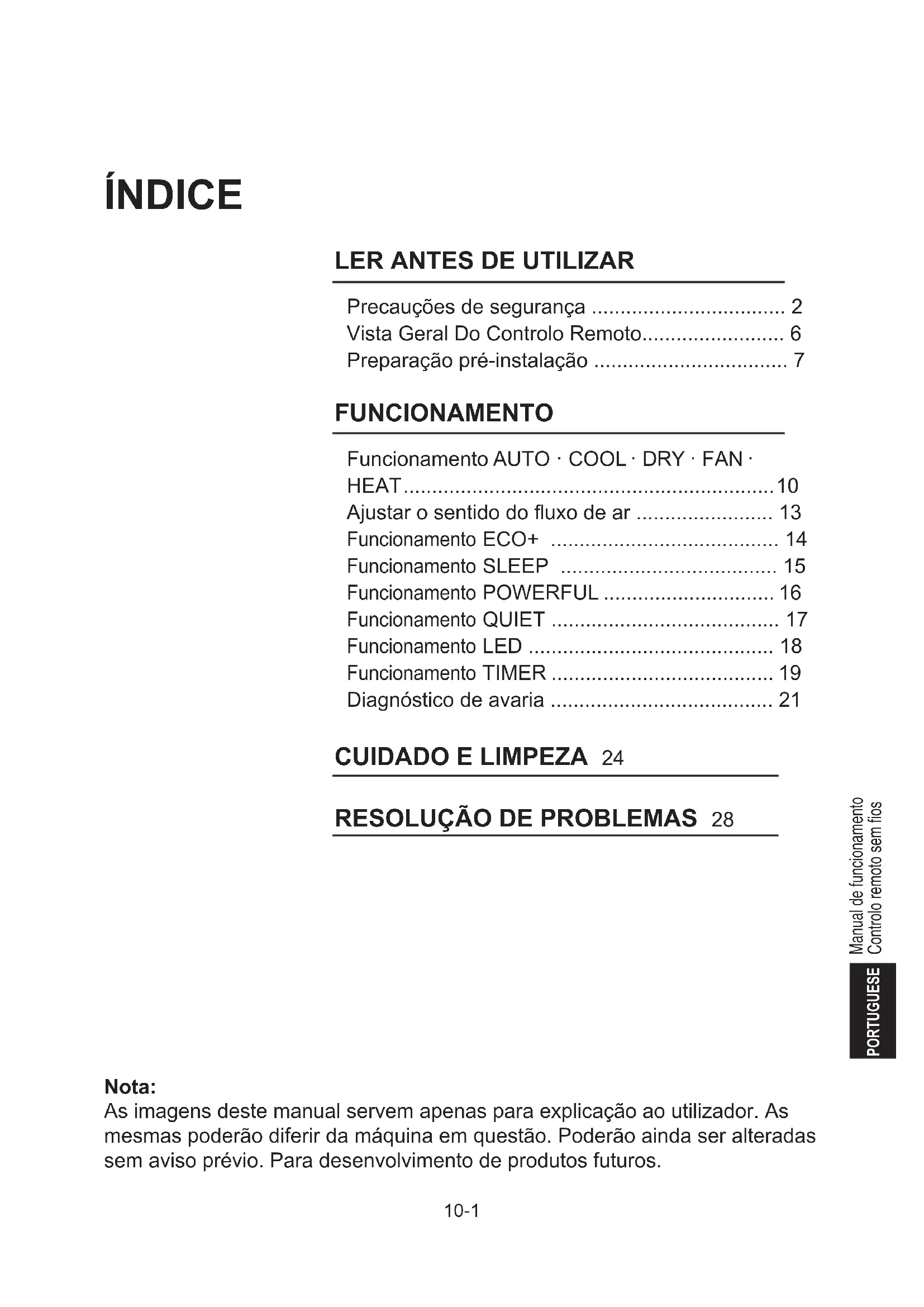 Wanneer de storingen blijven optreden, bel dan uw lokale dealer/servicedienst.Manual de funcionamento Controlo remoto sem fios PORTUGUESE 10-1 Nota: As imagens deste manual servem apenas para explicação ao utilizador. As mesmas poderão diferir da máquina em questão. Poderão ainda ser alteradas sem aviso prévio. Para desenvolvimento de produtos futuros. ÍNDICE