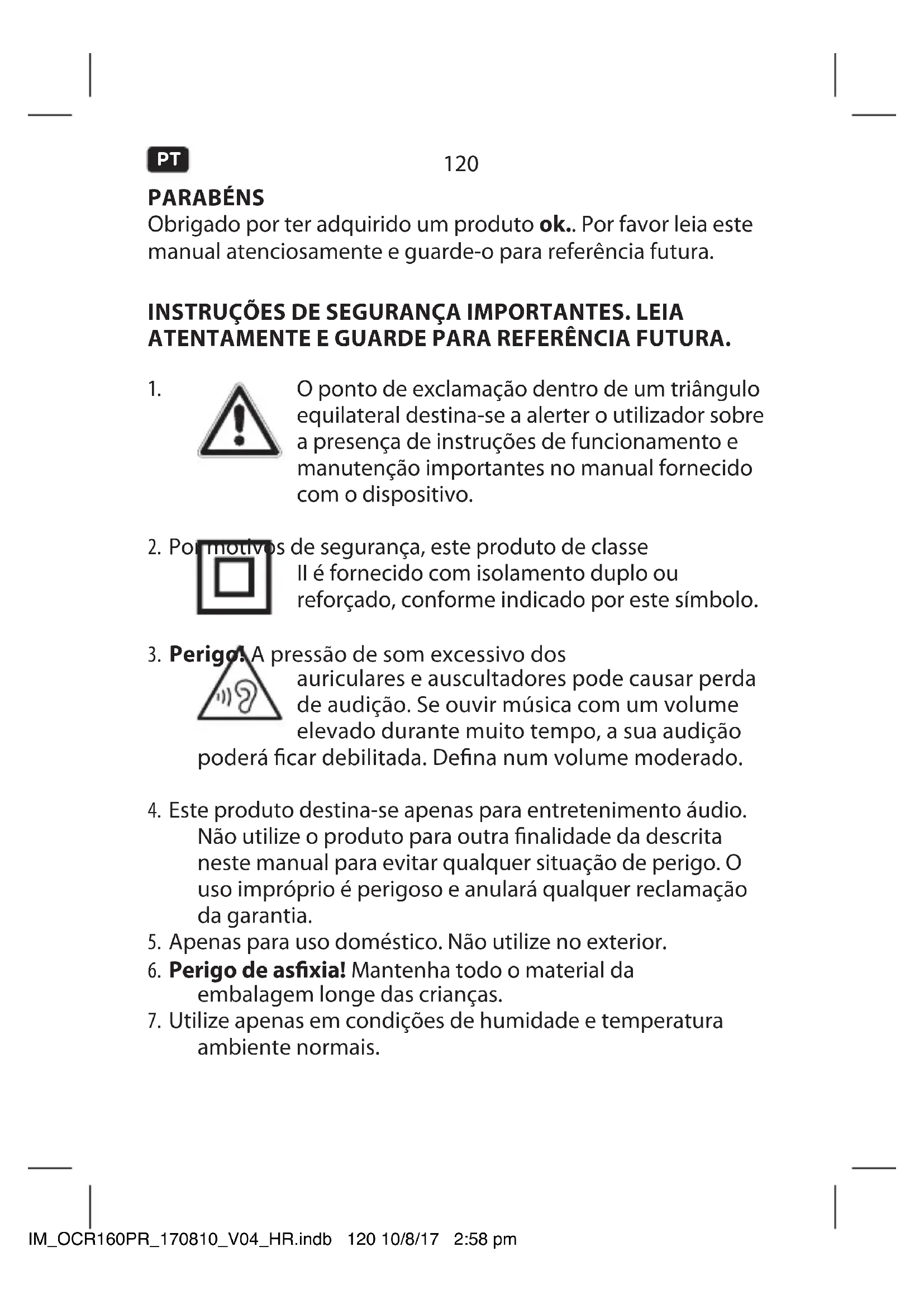 autorizado. Não tente reparar o produto sozinho. A assistência é necessária quando o produto ca danicado de qualquer forma como, por exemplo, o cabo de alimentação ou cha ca danicado, é derramado líquido, caem objectos no produto, a caixa é danicada, o produto é exposto à chuva ou humidade, funcionamento incorrecto ou queda. IM_OCR160PR_170810_V04_HR.indb 121 10/8/17 2:58 pm122