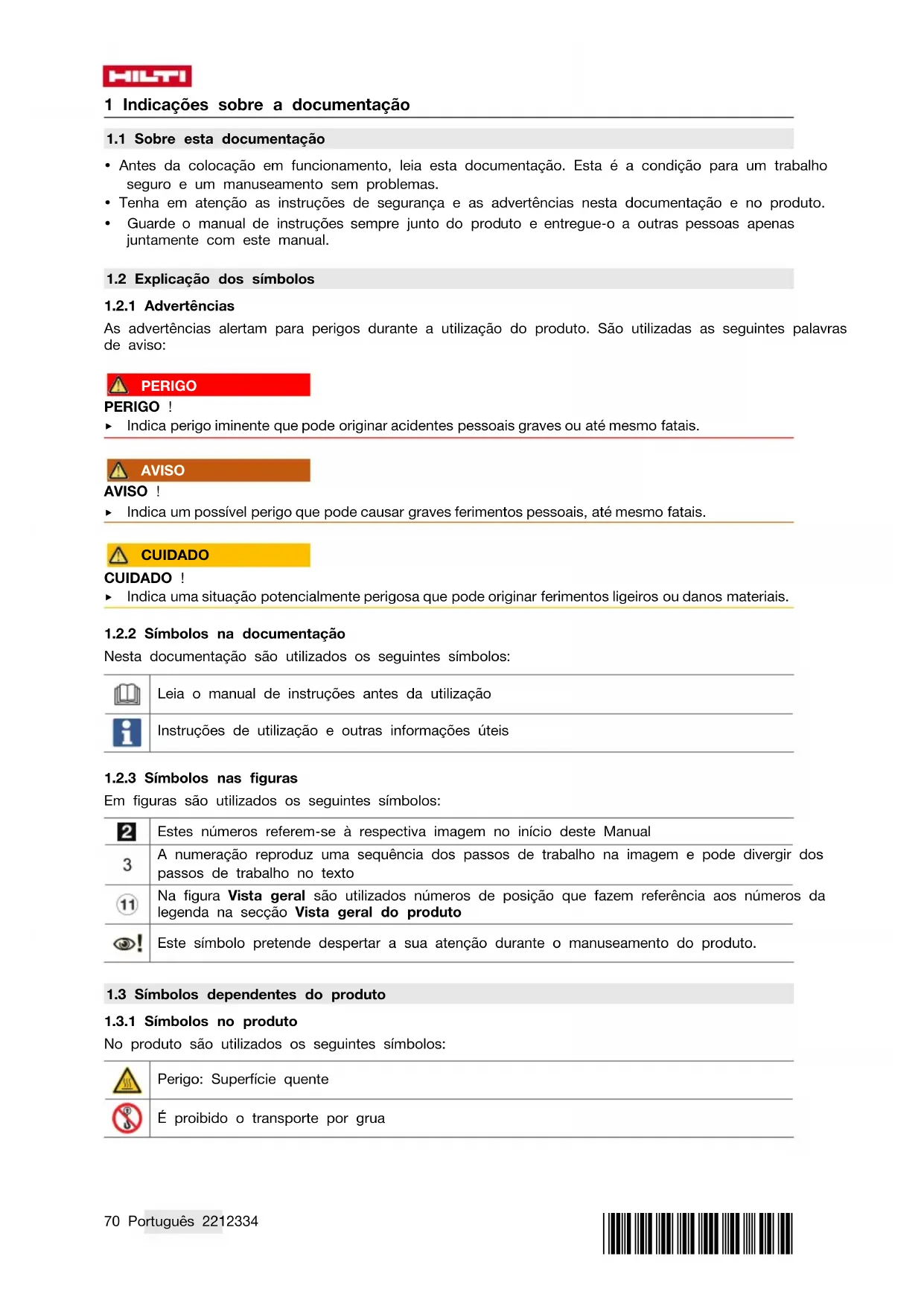Declaramos sob nossa exclusiva responsabilidade que o produto aqui descrito está em conformidade com as directivas e normas em vigor. Na parte final desta documentação encontra uma reprodução da declaração de conformidade. As documentações técnicas estão aqui guardadas: Hilti Entwicklungsgesellschaft mbH | Zulassung Geräte | Hiltistraße 6 | 86916 Kaufering, DE 2 Segurança