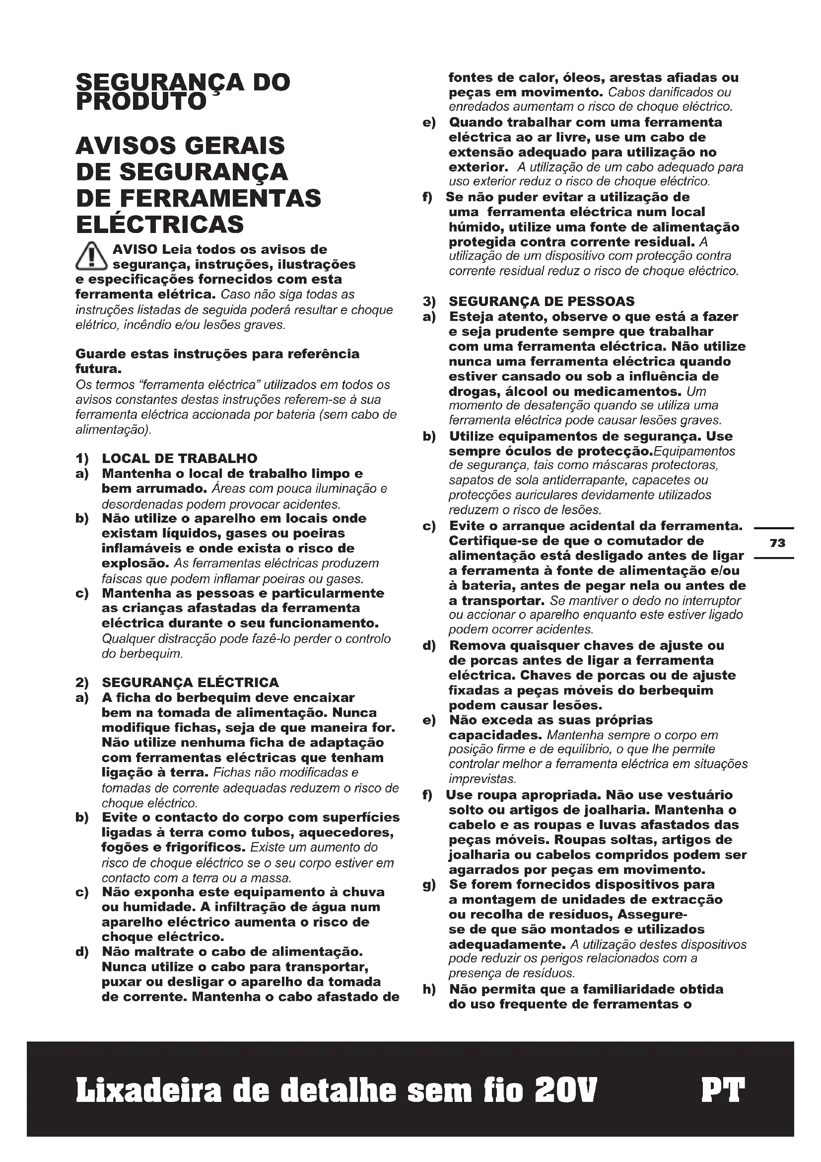 MULTILIXADORA Se a sua ferramenta aquecer muito, especialmente quando for utilizada a baixa velocidade, regule a velocidade no máximo e faça-a funcionar sem carga durante 2-3 minutos para arrefecer o motor. Evite utilizações prolongadas a velocidades muito baixas. Utilize sempre papel de lixa que seja adequado para o78 PTLixadeira de detalhe sem fio 20V material que pretende lixar. Assegure-se sempre de que a peça de trabalho está bem xa ou presa para impedir o movimento. Qualquer deslocação do material pode afectar a qualidade do acabamento da lixagem. Ligue a sua lixadeira antes de começar a lixar e desligue-a só depois de parar de lixar. Para obter melhores resultados, lixe a madeira na direcção do veio. Não comece a lixar sem o papel de lixa estar colocado. Não deixe o papel de lixa car desgastado porque isso danicará a placa base. A garantia não cobre o desgaste ou deterioração normal da placa base. Utilize papel de lixa de grão grosso para superfícies irregulares, de grão médio para superfícies macias e de grão no para acabamento de superfícies. de grão no para acabamento de superfícies. Se necessário, faça primeiro um teste numa peça de sucata. Utilize apenas papel de lixa de boa qualidade. É o papel de lixa que controla a eciência de lixagem e não a força que aplica na ferramenta. Uma força excessiva reduz a eciência de lixagem e provoca o sobreaquecimento do motor. Deve substituir periodicamente o papel de lixa para manter um óptimo rendimento de lixagem. MANUTENÇÃO Remova o conjunto de pilhas da ferramenta antes de realizar qualquer ajuste, reparação ou manutenção. A ferramenta elétrica não tem peças reparáveis pelo utilizador. Nunca utilize água ou produtos químicos para limpar a sua ferramenta. Limpe-a com um pano macio. Guarde sempre a sua ferramenta num local seco. Mantenha as ranhuras de ventilação do motor devidamente limpas. Mantenha todos os controlos de trabalho sem poeira. Se observar a ocorrência de faíscas nas ranhuras de ventilação, isso é normal e não danicará a sua ferramenta.