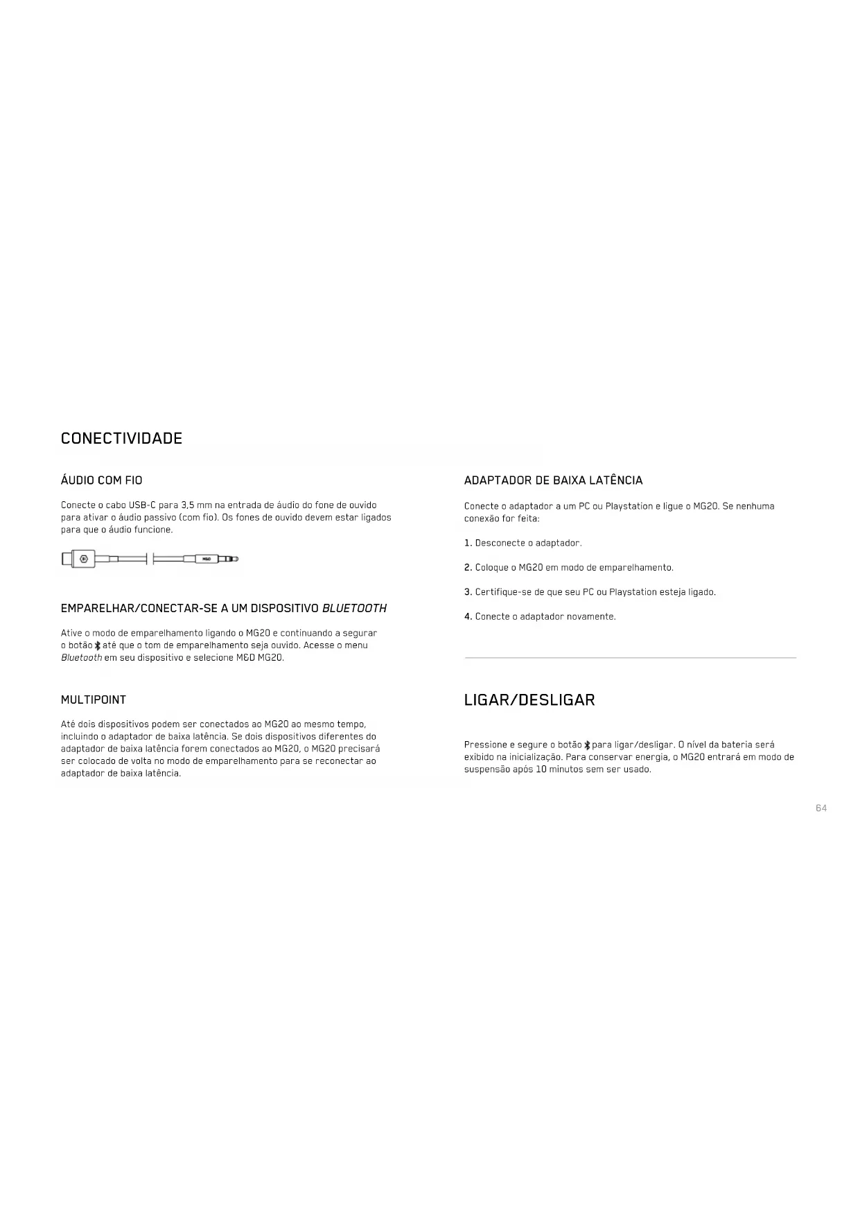MULTIPOINT Até dois dispositivos podem ser conectados ao MG20 ao mesmo tempo, incluindo o adaptador de baixa latência. Se dois dispositivos diferentes do adaptador de baixa latência forem conectados ao MG20, o MG20 precisará ser colocado de volta no modo de emparelhamento para se reconectar ao adaptador de baixa latência.