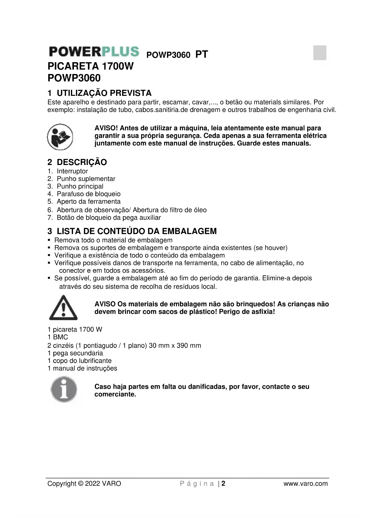 - Se possível, guarde a embalagem até ao fim do período de garantia. Elimine-a depois através do seu sistema de recolha de resíduos local. AVISO Os materiais de embalagem não são brinquedos! As crianças não devem brincar com sacos de plástico! Perigo de asfixia! 1 picareta 1700 W 1 BMC 2 cinzéis (1 pontiagudo / 1 plano) 30 mm x 390 mm 1 pega secundaria 1 copo do lubrificante 1 manual de instruções Caso haja partes em falta ou danificadas, por favor, contacte o seu comerciante.POWP3060 PT Copyright © 2022 VARO P á g i n a | 3 www.varo.com 4 SÍMBOLOS Neste manual e/ou na máquina são utilizados os seguintes símbolos: