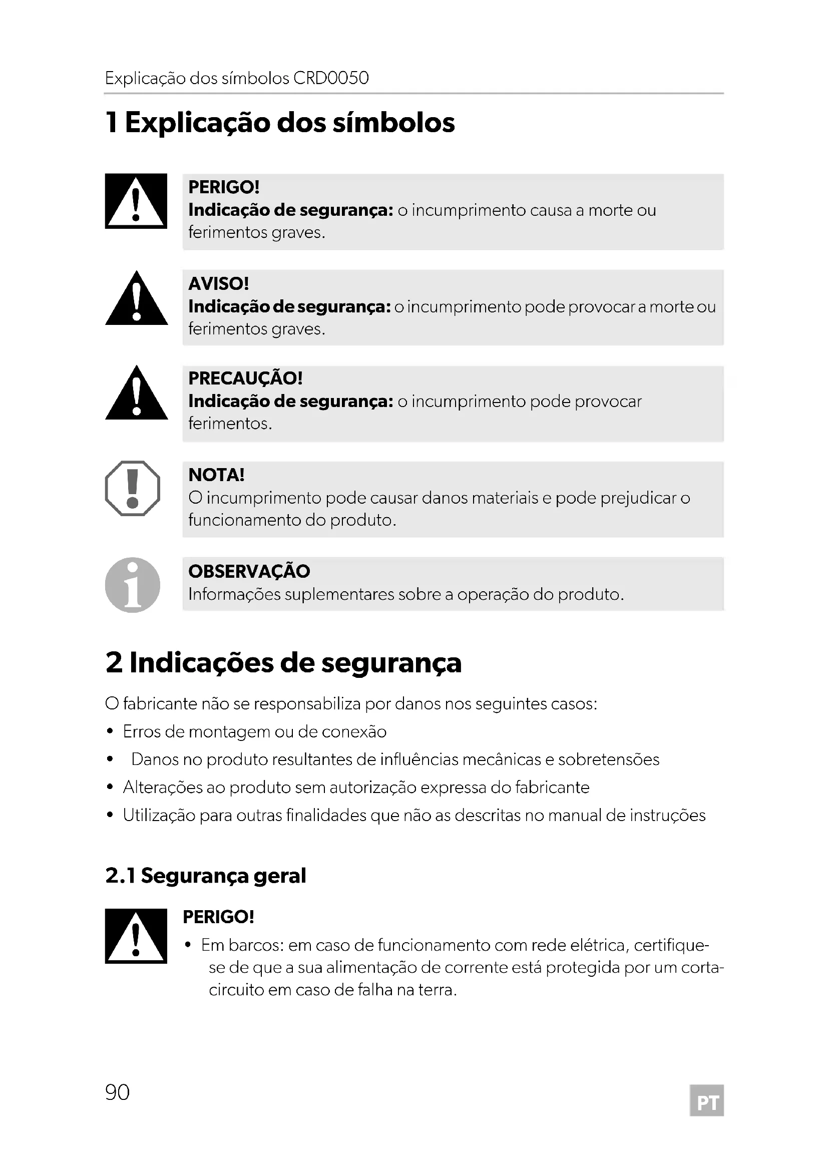 - Em barcos: em caso de funcionamento com rede elétrica, certifique- se de que a sua alimentação de corrente está protegida por um corta- circuito em caso de falha na terra. PERIGO! Indicação de segurança: o incumprimento causa a morte ou ferimentos graves. AVISO! Indicação de segurança: o incumprimento pode provocar a morte ou ferimentos graves. PRECAUÇÃO! Indicação de segurança: o incumprimento pode provocar ferimentos. NOTA! O incumprimento pode causar danos materiais e pode prejudicar o funcionamento do produto. OBSERVAÇÃO Informações suplementares sobre a operação do produto. CRD0050--IO-16s.book Seite 90 Mittwoch, 16. August 2017 10:30 10PT CRD0050 Indicações de segurança