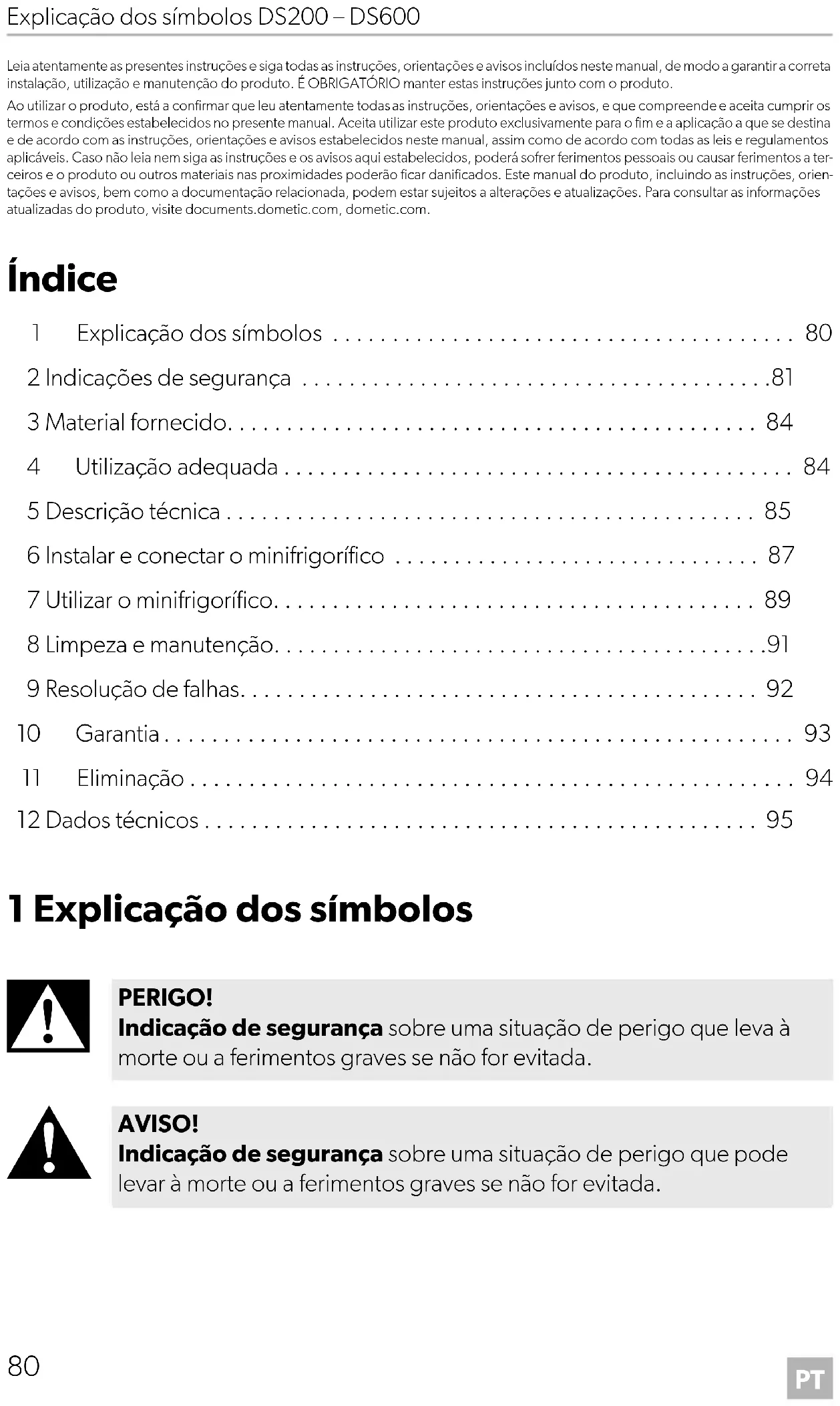 PERIGO! Indicação de segurança sobre uma situação de perigo que leva à morte ou a ferimentos graves se não for evitada. AVISO! Indicação de segurança sobre uma situação de perigo que pode levar à morte ou a ferimentos graves se não for evitada. DometicDS200-300-400-600_IOM_4445103315_EMEA16_2020-xx-xx.book Seite 80 Mittwoch, 3. März 2021 11:36 11PT DS200 – DS600 Indicações de segurança