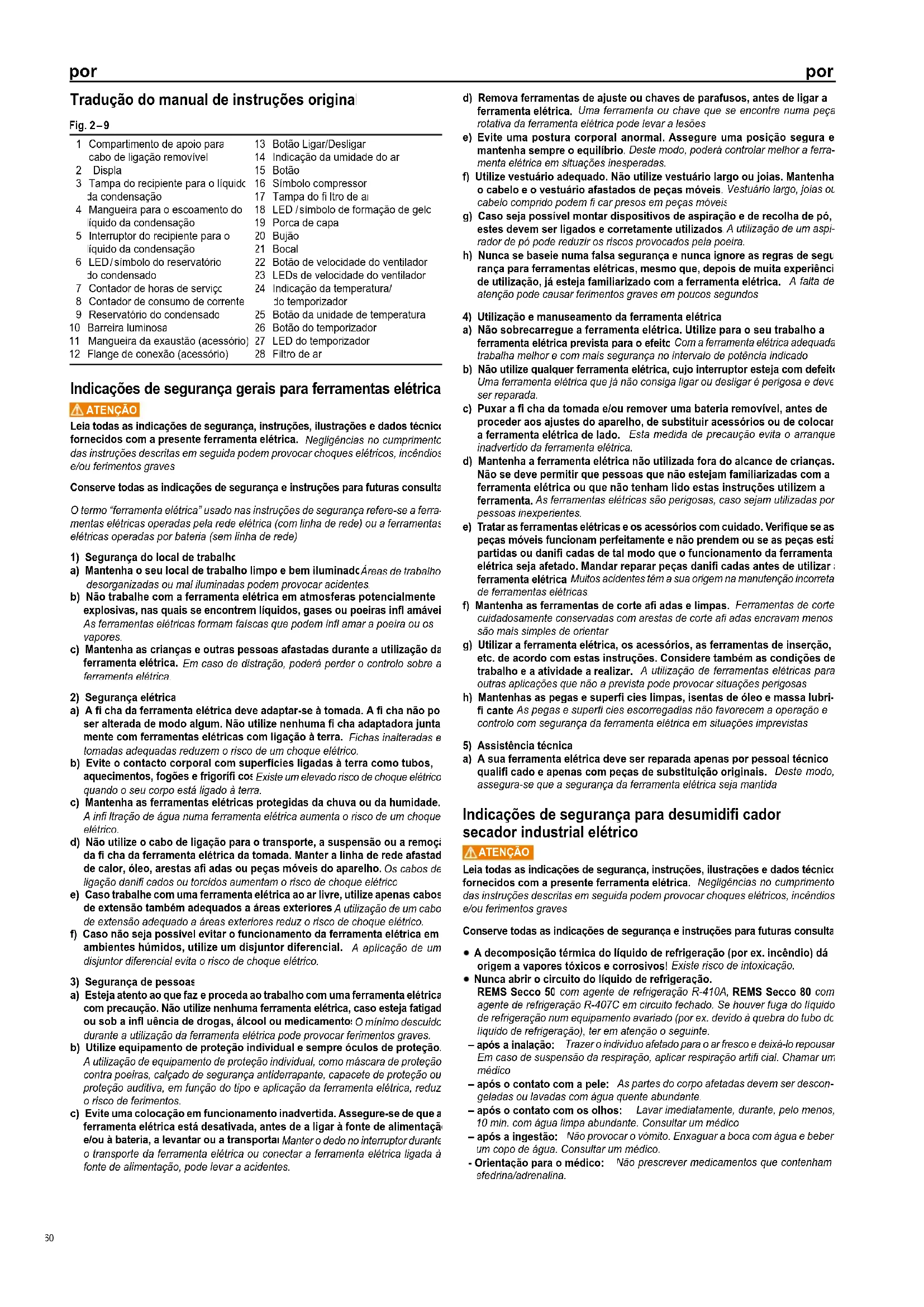 Nunca abrir o circuito do líquido de refrigeração. REMS Secco 50 com agente de refrigeração R-410A, REMS Secco 80 com agente de refrigeração R-407C em circuito fechado. Se houver fuga do líquido de refrigeração num equipamento avariado (por ex. devido à quebra do tubo do líquido de refrigeração), ter em atenção o seguinte: – após a inalação: Trazer o indivíduo afetado para o ar fresco e deixá-lo repousar. Em caso de suspensão da respiração, aplicar respiração artifi cial. Chamar um médico. – após o contato com a pele: As partes do corpo afetadas devem ser descon- geladas ou lavadas com água quente abundante. – após o contato com os olhos: Lavar imediatamente, durante, pelo menos, 10 min. com água limpa abundante. Consultar um médico. – após a ingestão: Não provocar o vómito. Enxaguar a boca com água e beber um copo de água. Consultar um médico. - Orientação para o médico: Não prescrever medicamentos que contenham efedrina/adrenalina. Fig. 2 – 9 1 Compartimento de apoio para cabo de ligação removível 2 Display 3 Tampa do recipiente para o líquido da condensação 4 Mangueira para o escoamento do líquido da condensação 5 Interruptor do recipiente para o líquido da condensação 6 LED / símbolo do reservatório do condensado 7 Contador de horas de serviço 8 Contador de consumo de corrente 9 Reservatório do condensado 10 Barreira luminosa 11 Mangueira da exaustão (acessório) 12 Flange de conexão (acessório) 13 Botão Ligar/Desligar 14 Indicação da umidade do ar 15 Botão 16 Símbolo compressor 17 Tampa do fi ltro de ar 18 LED / símbolo de formação de gelo 19 Porca de capa 20 Bujão 21 Bocal 22 Botão de velocidade do ventilador 23 LEDs de velocidade do ventilador 24 Indicação da temperatura/ do temporizador 25 Botão da unidade de temperatura 26 Botão do temporizador 27 LED do temporizador 28 Filtro de ar por por 60REMS Secco 50