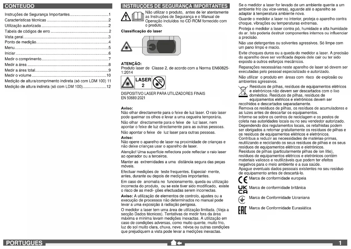- EN 50689:2021 Aviso: Não olhar directamente para o feixe de luz laser. O raio laser pode queimar os olhos e levar a uma cegueira temporária. Não olhar directamente para o feixe de luz laser, nem apontar o feixe de luz directamente para as outras pessoas. Não apontar o feixe de luz laser para outras pessoas. Aviso: Não opere o aparelho de laser na proximidade de crianças e não deixe crianças usar o aparelho de laser. Atenção! Uma superfície reectora pode reectar o raio laser ao operador ou a terceiros. Manter as extremidades a uma distância segura das peças móveis. Efectuar medições de teste frequentes. Especial- mente, antes, durante ou depois de medições importantes. Em caso de anomalia no funcionamento, queda ou utilização incorrecta do produto, ou se este tiver sido modicado, existe o risco de as medi- ções efectuadas serem incorrectas. Aviso: A utilização de elementos de controlo, ajustes ou a execução de processos não determinados no manual pode levar a uma exposição à radiação perigosa. O medidor a laser tem uma área de utilização limitada. (Veja a secção Dados técnicos). Tentativas de medir fora da área máxima e mínima levam medições inexactas. A utilização em caso de condições adversas, como muito quente, muito frio, luz do sol muito clara, chuva, neve, névoa ou outras condições que prejudiquem a vista pode levar a medições inexactas. Se o medidor a laser for levado de um ambiente quente a um ambiente frio (ou vice-versa), aguarde até o aparelho se adaptar à temperatura ambiente nova. Guarde o medidor a laser no interior, proteja o aparelho contra choque, vibrações ou temperaturas extremas. Proteja o medidor a laser contra pó, humidade e alta humidade do ar. Isto poderia destruir componentes internos ou inuenciar a precisão. Não use detergentes ou solventes agressivos. Só limpe com um pano limpo e macio. Evite choques duros ou a queda do medidor a laser. A precisão do aparelho deve ser vericada depois dele cair ou ter sido exposto a outros esforços mecânicos. Reparações necessárias neste aparelho de laser só devem ser executadas pelo pessoal especializado e autorizado. Não utilizar o produto em áreas com risco de explosão ou ambientes agressivos. Resíduos de pilhas, resíduos de equipamentos elétricos e eletrónicos não devem ser descartados com o lixo doméstico. Resíduos de pilhas, resíduos de equipamentos elétricos e eletrónicos devem ser recolhidos e descartados separadamente. Remova os resíduos de pilhas, os resíduos de acumuladores e as luzes antes de descartar os equipamentos. Informe-se sobre os centros de reciclagem e os postos de coleta nas autoridades locais ou no seu vendedor autorizado. Dependendo dos regulamentos locais, os retalhistas podem ser obrigados a retomar gratuitamente os resíduos de pilhas e os resíduos de equipamentos elétricos e eletrónicos. Contribua a reduzir as necessidades de matérias-primas, reutilizando e reciclando os seus resíduos de pilhas e os seus resíduos de equipamentos elétricos e eletrónicos. Resíduos de pilhas (particularmente pilhas de íon lítio), resíduos de equipamentos elétricos e eletrónicos contém materiais valiosos e reutilizáveis que podem ter efeitos negativos para o meio ambiente e a sua saúde. Apague eventuais dados pessoais existentes no seu resíduo de equipamento antes de descartá-lo. Marca de conformidade europeia Marca de conformidade britânica Marca de Conformidade Ucraniana Marca de Conformidade Eurasiática CONTEÚDO Instruções de Segurança Importantes p. 1