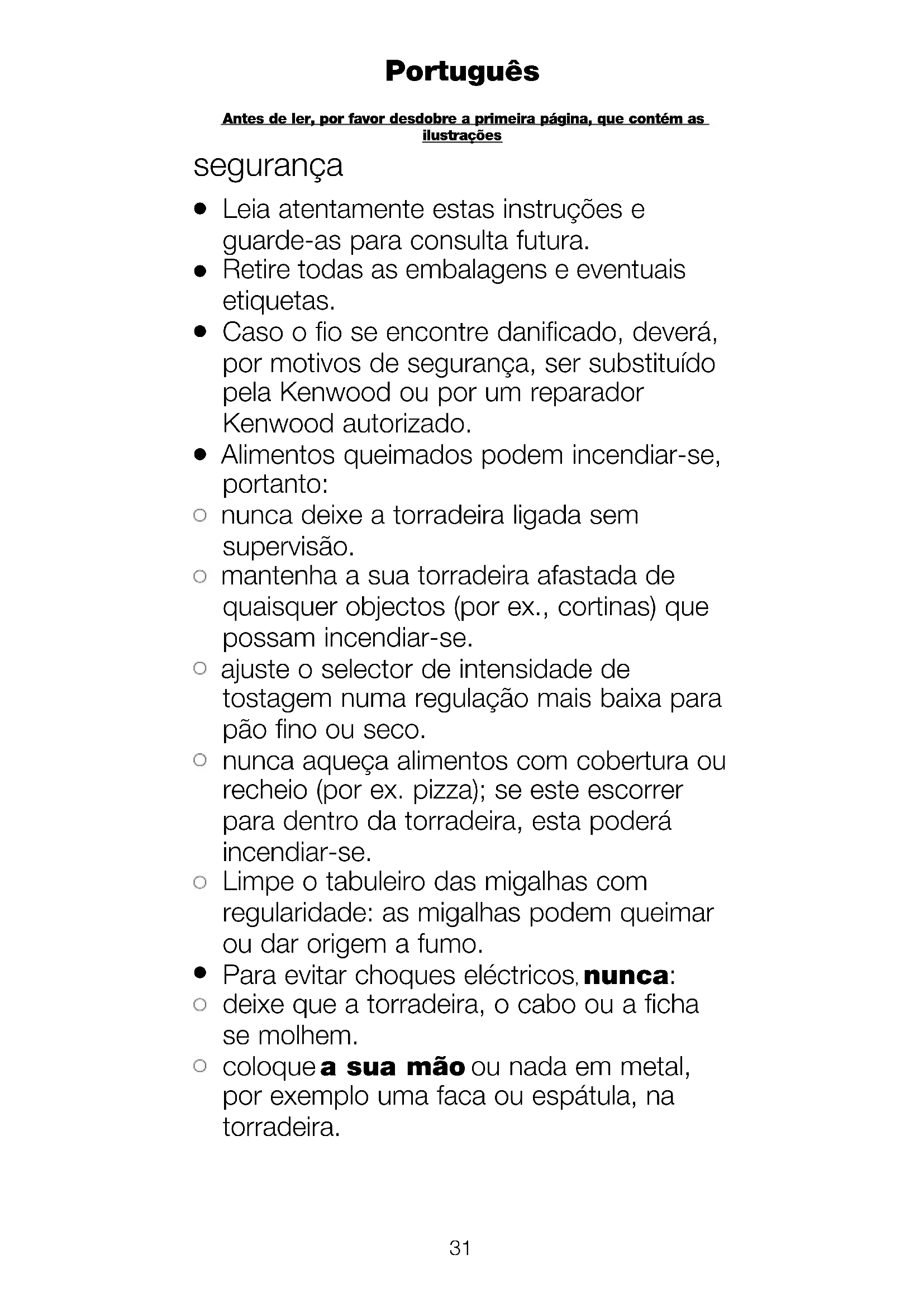 coloque a sua mão ou nada em metal, por exemplo uma faca ou espátula, na torradeira. Antes de ler, por favor desdobre a primeira página, que contém as ilustraçõesEnglish