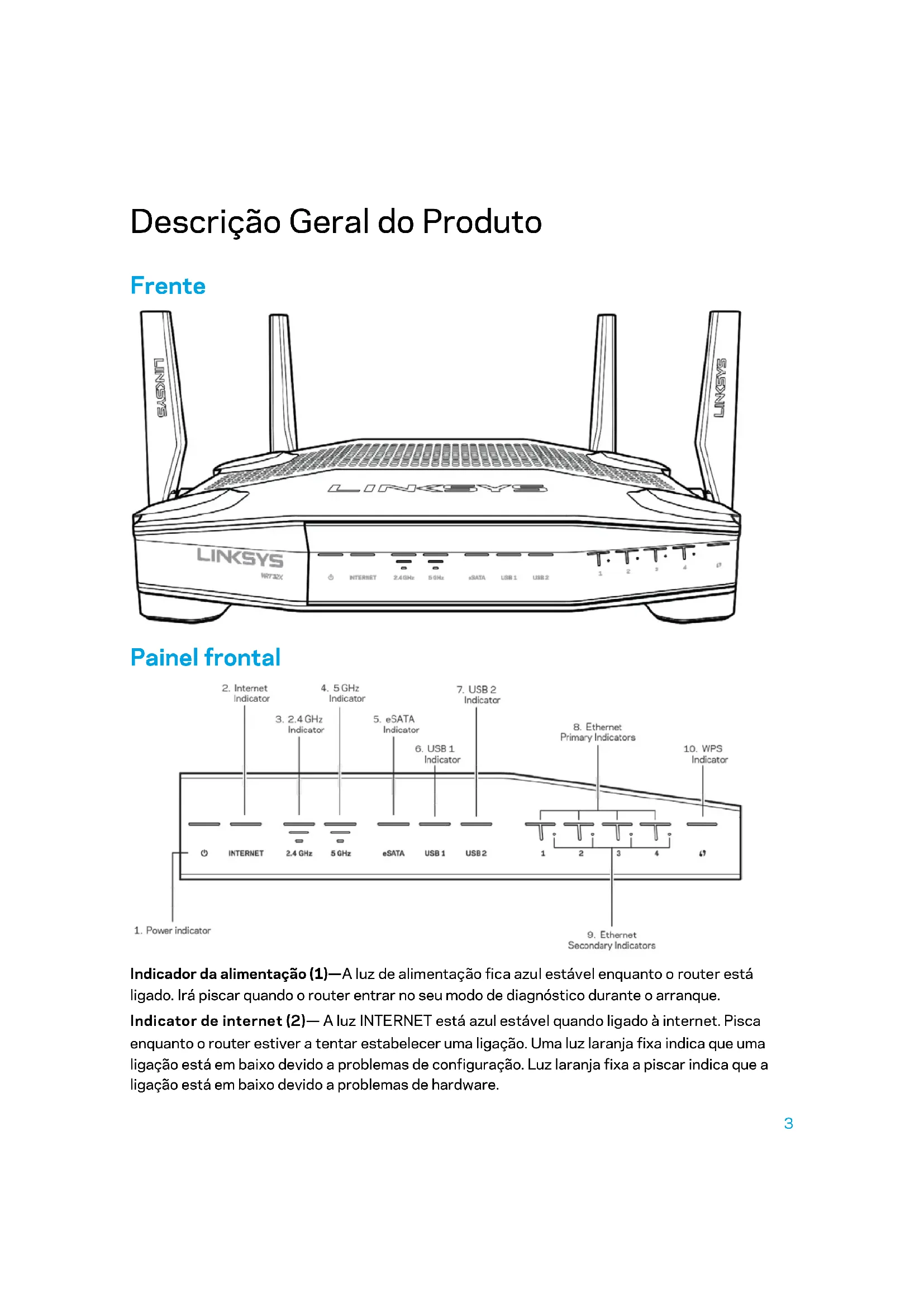 - Ambiente Descrição Geral do Produto Frente Painel frontal Indicador da alimentação (1)—A luz de alimentação fica azul estável enquanto o router está ligado. Irá piscar quando o router entrar no seu modo de diagnóstico durante o arranque. Indicator de internet (2)— A luz INTERNET está azul estável quando ligado à internet. Pisca enquanto o router estiver a tentar estabelecer uma ligação. Uma luz laranja fixa indica que uma ligação está em baixo devido a problemas de configuração. Luz laranja fixa a piscar indica que a ligação está em baixo devido a problemas de hardware.4 Indicador de 2,4 GHz (3)—A luz fica azul estável enquanto um ou mais clientes estiverem ligados à rede de 2,4 GHz. A luz pisca quando o router está a enviar ou a receber dados através da rede de 2,4 GHz. Indicador de 5 GHz (4)—A luz fica azul estável enquanto um ou mais clientes estiverem ligados à rede de 5 GHz. A luz pisca quando o router está a enviar ou a receber dados através da rede de 5 GHz. Indicador eSATA (5)—Quando apagado, a porta USB/eSATA está desligada ou está ligado um equipamento USB. A luz fica permanentemente acesa a azul quando um dispositivo eSATA está ligado. A luz pisca para indicar atividade através da porta eSATA. Indicador USB1 (6)—Quando apagado, a porta USB/eSATA está desligada ou está ligado um equipamento eSATA. A luz fica permanentemente acesa a azul quando um dispositivo USB está ligado. A luz pisca para indicar atividade através da porta. Indicador USB2 (7)—A luz fica permanentemente acesa a azul quando um dispositivo USB está ligado. A luz pisca para indicar atividade através da porta. ETHERNET 1 a 4 (Primário) (8)—Estas luzes numeradas correspondem às portas numeradas no painel traseiro do router. Se a luz estiver permanentemente acesa a azul, o router está ligado a um dispositivo através dessa porta. A luz pisca para indicar atividade de rede através dessa porta. ETHERNET 1 até 4 (Secundário) (9)—Se a luz estiver desligada, o router está ligado a um equipamento através dessa porta a 10/100 Mbps. Uma luz azul fixa indica que o router está ligado a um equipamento a 1000 Mbps. Indicador WPS (10)—A luz pisca lentamente durante até dois minutos durante a configuração Wi-Fi Protected Setup. Ficará azul sólida durante cinco segundos para indicar uma ligação com sucesso. A luz pisca a laranja se o processo de configuração WPS falhar. Se isso acontecer verifique se o dispositivo cliente suporta a norma WPS. Aguarde até a luz se apagar e depois tente novamente. O router suporta uma sessão WPS de cada vez.5 Voltar Antenas ajustáveis (1) — As quatro antenas externas ajustáveis devem ser ligadas ao router antes de o ligar. Enrosque o conector da antena no sentido do ponteiro dos relógios sobre a porta da antena no router. Nota p. 213
