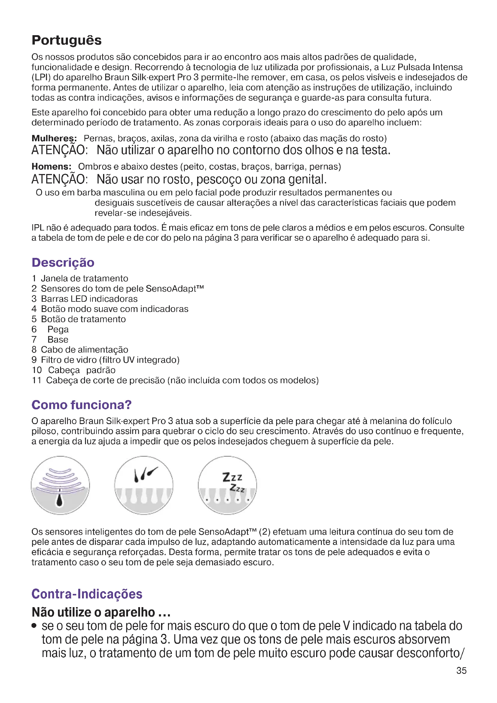 - Se observar alterações na sua pele a nível da pigmentação, por exemplo, se ficar mais clara ou mais escura, pare de utilizar o aparelho. Procure aconselhamento médico para determinar a causa do sucedido que pode resultar de um problema de saúde subjacente. Plano de tratamento Fase inicial 1 tratamento por semana (4-12 semanas) Tratamento de manutenção prossiga o tratamento de acordo com as suas necessidades, p. ex., a cada 1-2 meses O ciclo de crescimento dos pelos normal varia de indivíduo para indivíduo e pode alcançar 16 meses, consoante a zona do corpo em questão (axilas, parte inferior da perna, virilha). Dado que o tratamento por luz só pode ser aplicado nos pelos na sua fase de crescimento, é importante efetuar tratamentos múltiplos para alcançar uma pele sempre macia. Por este motivo, recomendamos uma fase inicial de um tratamento por semana durante um período de 4 - 12 semanas. Caso constate que os pelos deixaram de crescer, não será necessário concluir as 12 semanas de tratamento completas e poderá passar para os tratamentos de manutenção. Após o tratamento Depois de concluir o seu tratamento, retire o cabo de alimentação da tomada elétrica. Após o tratamento, recomendamos a aplicação de protetor solar SPF 15 sempre que as zonas tratadas sejam expostas ao sol. Recomendamos que se evite a exposição a fontes de luz artificiais, como câmaras de bronzeamento ou solários. Evite quaisquer atividades ou produtos para a pele suscetíveis de provocar irritação durante as 24 horas após o tratamento. O que inclui jacúzis ou saunas, o uso de roupa justa, cremes descolorantes, produtos perfumados ou produtos de peeling. As situações acima indicadas podem causar irritação na pele, tal como prurido e vermelhidão nas áreas tratadas. Limpeza e armazenamento Após cada tratamento, os sensores do tom da pele (2) e a janela de operação (1) devem ser inspecionados em relação a danos e limpos com um pano seco que não largue pelos. Se forem observadas algumas marcas ou pontos negros, limpe-os imediatamente após o tratamento. Não toque ou limpe o filtro de vidro (9) imediatamente após a utilização enquanto este arrefece. Após a utilização, limpe o aparelho e, sobretudo, a janela de tratamento com um pano seco que não liberte pelos. O aparelho não deve ser enxaguado nem colocado dentro de água ou de qualquer outro líquido. Para garantir o máximo desempenho, mantenhas as cabeças (10, 11) com os refletores incorporados sem sujidade, pelos ou outros resíduos. Não lavar com água, utilize um pano seco para limpá-las cuidadosamente. Arrume o aparelho num local fresco e seco. Certifique-se de que a janela de tratamento e os sensores de pele estão protegidos de possíveis danos. Possíveis efeitos secundários Ao utilizar o aparelho, algumas pessoas poderão sentir um ligeiro desconforto (por exemplo, sensação de calor ou vermelhidão na pele) – isto é normal. Quando a luz é emitida, poderá sentir calor e um formigueiro, seguido de vermelhidão na pele. Este tipo de reação desaparece normalmente num prazo de 24 horas. As reações adversas são geralmente imediatas ou surgem num espaço de 24 horas. Em casos raros, poderão levar até 72 horas a aparecer. Contacte o seu médico, caso sinta alguma reação anormal da pele.41 Efeito secundário Como avaliar e reagir Sensação de calor ou formigueiro na pele durante o tratamento que normalmente desaparece no espaço de alguns segundos a minutos e que diminui com a utilização. Esta é uma reação esperada e normal para todos os tratamentos com aparelhos por LPI. Pode continuar a utilizar o aparelho de acordo com as instruções fornecidas. Desconforto ou dor intensa durante o tratamento ou que persiste após um tratamento. Pare de utilizar o aparelho e consulte o seu médico antes de o utilizar novamente. Vermelhidão da pele durante ou após o tratamento, que desaparece no espaço de minutos a algumas horas. Esta é uma reação esperada e normal para todos os tratamentos com aparelhos por LPI. Pode continuar a utilizar o aparelho de acordo com as instruções fornecidas, assim que a vermelhidão da pele desaparecer. Vermelhidão da pele que não desaparece num espaço de 24 a 48 horas após o tratamento. Pare de utilizar o aparelho e consulte o seu médico antes de o utilizar novamente. Em casos muitos raros: Inchaço e vermelhidão em torno do folículo piloso que desaparece no espaço de dois ou três dias. Pode continuar a utilizar o aparelho de acordo com as instruções fornecidas, quando o inchaço e a vermelhidão em torno do folículo piloso desaparecerem. Inchaço e vermelhidão em torno do folículo piloso que não desaparecem no espaço de dois a três dias. Pare de utilizar o aparelho e consulte o seu médico antes de o utilizar novamente. Alterações temporárias da coloração da pele (manchas mais claras ou mais escuras). Se verificar uma alteração da coloração da sua pele, pare de utilizar o aparelho e consulte o seu médico. Aumento do crescimento dos pelos nas áreas de tratamento (pessoas de origem mediterrânica são mais propensas a isso). Se este aumento persistir ao longo de diversos tratamentos, pare de utilizar o aparelho e consulte o seu médico. Resolução de problemas O seguinte guia de resolução de problemas pode ajudá-lo a resolver problemas iniciais que se possam verificar com este aparelho. Problema Solução As barras indicadoras não se acendem quando a janela de tratamento é colocada sobre a pele. Certifique-se de que o aparelho está ligado a uma tomada elétrica. Prima o botão de modo suave (4) para ativar. Certifique-se de que os sensores do tom de pele estão em pleno contacto com a pele. Se necessário, mova o aparelho de forma a que os sensores do tom de pele entrem em contacto com a pele. O aparelho não funciona em áreas reduzidas. Utilize a cabeça de corte de precisão (se disponível) nas áreas pequenas e de difícil aces