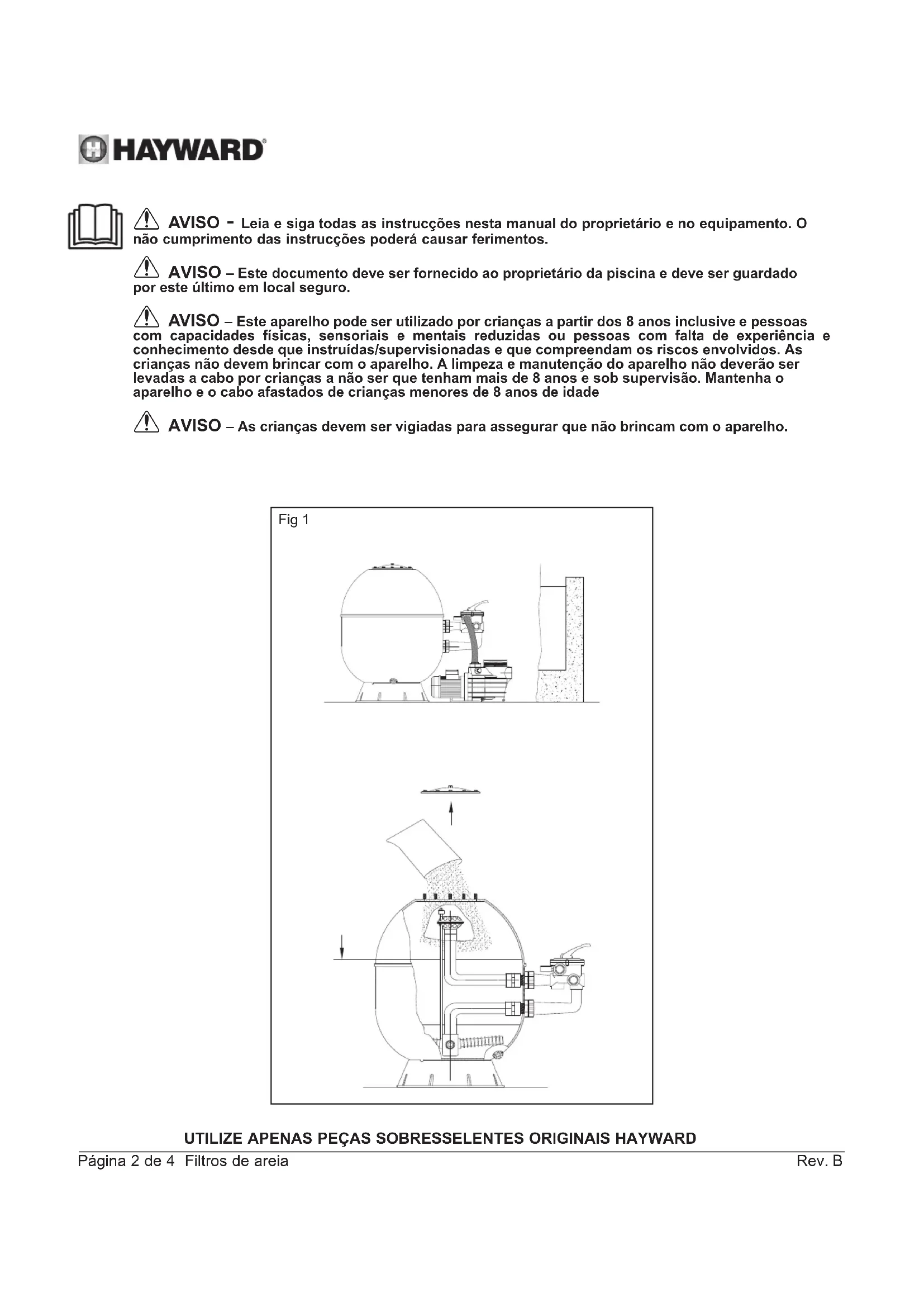 AVISO – As crianças devem ser vigiadas para assegurar que não brincam com o aparelho. Fig 1UTILIZE APENAS PEÇAS SOBRESSELENTES ORIGINAIS HAYWARD Página 3 de 4 Filtros de areia Rev. B Acaba de adquirir um filtro de areia, com a respetiva base e válvula. FUNCIONAMENTO O filtro utiliza uma areia especial destinada a reter as impurezas contidas na água da piscina. A areia é deitada na cuba e funciona como um sistema de filtração permanente. A água não filtrada da piscina, que contém as impurezas em suspensão, é aspirada pela bomba e enviada para a válvula de controlo multivias. Quando a água passa pela areia, as impurezas são retidas no leito de areia e a água volta a sair filtrada para a piscina. INSTALAÇÃO