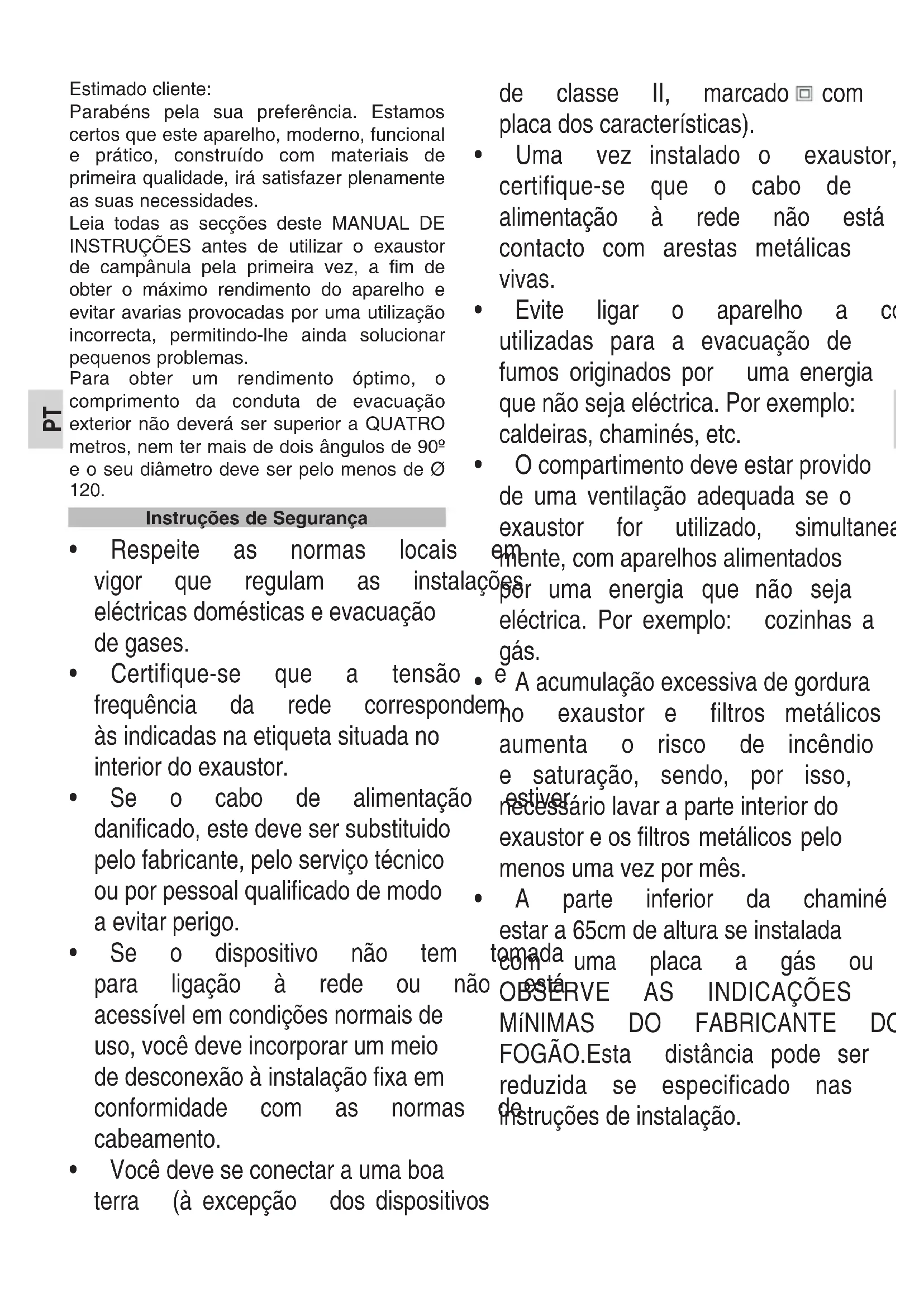 - As velocidades intensivas 6, 7 e 8 não podem ser programadas; devem ser selecionadas manualmente e têm uma duração máxima de 10 minutos aproximadamentePT O fabricante reserva-se ao direito de introduzir nos seus equipamentos as correcções que considere necessárias sem prejudicar as suas características principais. Em caso de Alguma Avaria Antes de telefonar ao Serviço Técnico, faça as seguintes verificações: Filtros de Carbono Activo A duração dos filtros de carbono activo varia entre três e seis meses, dependendo das condições particulares de utilização. Estes filtros não são laváveis nem reutilizáveis, pelo que devem ser substituídos sempre que termina a sua vida útil. Problema Possível causa Solução O exaustor não funciona. O cabo de alimentação do exaustor não está ligado à rede. Não há corrente na rede. Ligue cabo de alimentação à rede. Certifique-se que a rede tem corrente. O exaustor não aspira o suficiente ou vibra. Filtros saturados de gordura. Obstrução na conduta de salda de ar. Substitua ou limpe os filtros de carbono activo e/ou metálicos. Elimine a obstrução. Esta campanha é muito eficiente e economiza energia. As seguintes medidas ajudam a economizar energia: - Assegurar uma boa ventilação na cozinha quando você está cozinhando. Se você não conseguir ar suficiente no modo de tração, o exaustor não estiver funcionando de forma eficiente e leva a um aumento de ruído. - Cozinhe com o menor cozinhar nível possível. Pouco de vapor significa que você pode usar uma velocidade baixa no capô e, portanto, menos consumo de energia. - Verificar a velocidade selecionada do capô. Normalmente, uma velocidade baixa é suficiente. Usando a velocidade intensiva apenas quando necessário. - Quando muitos vapores de cozinha são gerados, coloque o sino em uma alta velocidade o mais rápido possível. Isso é mais eficiente do que tentar absorver vapores e se espalhou para a cozinha através de uma operação capô alongado. - Certifique-se de transformar o sino depois de terminar de cozinhar. - Limpe ou troque os filtros em intervalos regulares. Altamente contaminada filtros reduzem o desempenho, aumentar o risco de incêndio e são um risco para a higiene. Dicas de economia de energía Protección del medio ambiente - Descartar materiais de embalagem e equipamento antigo. - Livrar-se por favor de embalagem de transporte, respeitando o meio ambiente. - Aparelhos velhos contêm materiais valiosos. Mão sobre seu antigo aparelho num ponto de recolha de materiais recicláveis. Os aparelhos antigos inservíveis antes do descarte. Assim, a sua utilização incorrecta é evitada. - Reciclar baterias usadas ou defeituosas em conformidade com os regulamentos locais. - Não jogue as baterias no lixo doméstico.Stimato cliente: Grazie della Sua scelta. Siamo sicuri che questo apparato, moderno, funzionale e pratico, costruito con materiali di prima qualità, soddisfará pienamente le sue esigenze. Legga tutti i capitoli di questo MANUALE DI ISTRUZIONI prima di utilizzare la cappa per la prima volta, allo scopo di ottenere il massimo rendimento dall’apparato ed evitare dei guasti che potrebbero derivarsi da un uso scorretto, oltre a permetterle di risolvere possibili problemi. Conservi questo manuale che le potrà dare informazioni utili sulla sua cappa in qualsiasi momento e renderà più facile l’uso dell’apparato ad altre persone. Per prestazioni ottimali, il condotto esterno non deve superare i quattro metri ne più di due angoli di 90 °, ed il suo diametro deve essere almeno di Ø120.