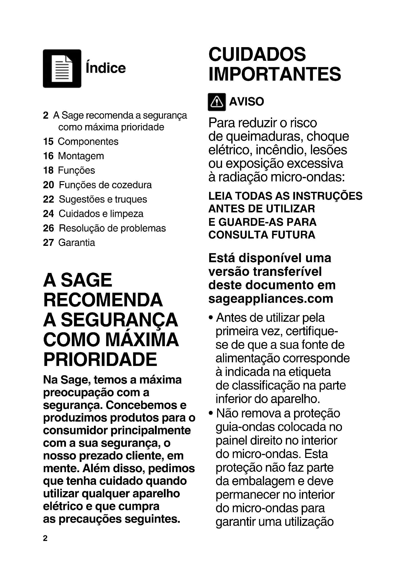 PRIORIDADE Na Sage, temos a máxima preocupação com a segurança. Concebemos e produzimos produtos para o consumidor principalmente com a sua segurança, o nosso prezado cliente, em mente. Além disso, pedimos que tenha cuidado quando utilizar qualquer aparelho elétrico e que cumpra as precauções seguintes. CUIDADOS IMPORTANTES AVISO Para reduzir o risco de queimaduras, choque elétrico, incêndio, lesões ou exposição excessiva à radiação micro-ondas: LEIA TODAS AS INSTRUÇÕES ANTES DE UTILIZAR E GUARDE-AS PARA CONSULTA FUTURA Está disponível uma versão transferível deste documento em sageappliances.com
