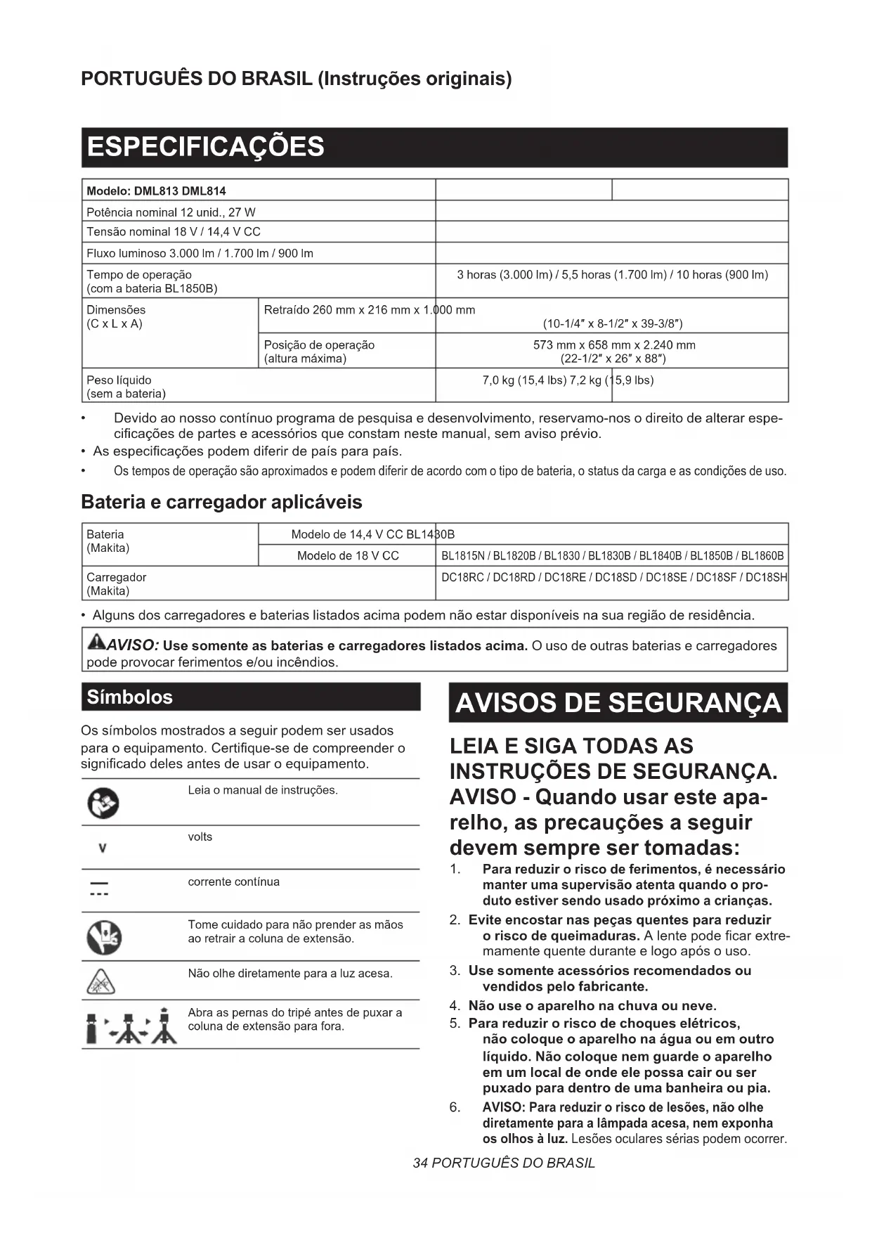- Alguns dos carregadores e baterias listados acima podem não estar disponíveis na sua região de residência. AVISO: Use somente as baterias e carregadores listados acima. O uso de outras baterias e carregadores pode provocar ferimentos e/ou incêndios. Símbolos Os símbolos mostrados a seguir podem ser usados para o equipamento. Certique-se de compreender o signicado deles antes de usar o equipamento. Leia o manual de instruções.voltscorrente contínuaTome cuidado para não prender as mãos ao retrair a coluna de extensão.Não olhe diretamente para a luz acesa.Abra as pernas do tripé antes de puxar a coluna de extensão para fora.