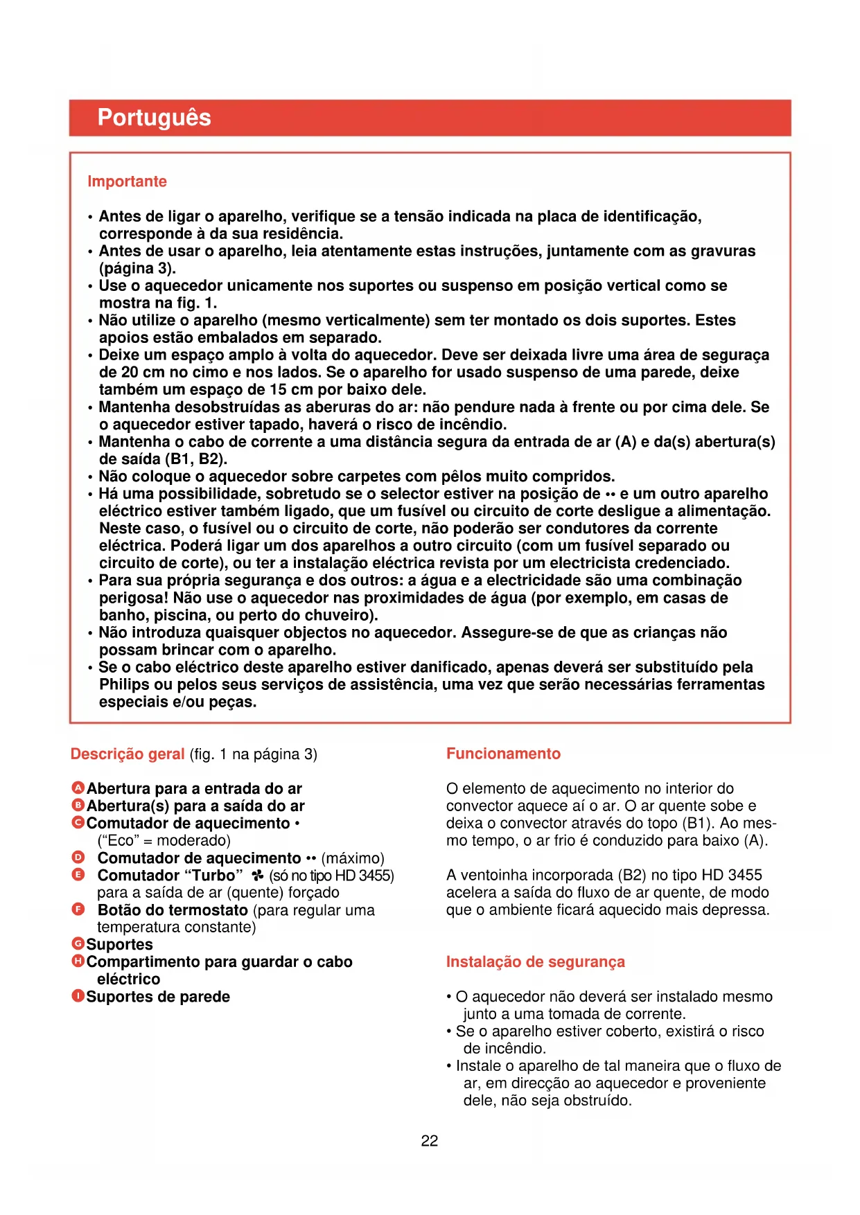 Descrição geral (fig. 1 na página 3) A Abertura para a entrada do ar B Abertura(s) para a saída do ar C Comutador de aquecimento • (“Eco” = moderado) D Comutador de aquecimento •• (máximo) E Comutador “Turbo” > (só no tipo HD 3455) para a saída de ar (quente) forçado F Botão do termostato (para regular uma temperatura constante) G Suportes H Compartimento para guardar o cabo eléctrico I Suportes de parede Funcionamento O elemento de aquecimento no interior do convector aquece aí o ar. O ar quente sobe e deixa o convector através do topo (B1). Ao mes- mo tempo, o ar frio é conduzido para baixo (A). A ventoinha incorporada (B2) no tipo HD 3455 acelera a saída do fluxo de ar quente, de modo que o ambiente ficará aquecido mais depressa. Instalação de segurança