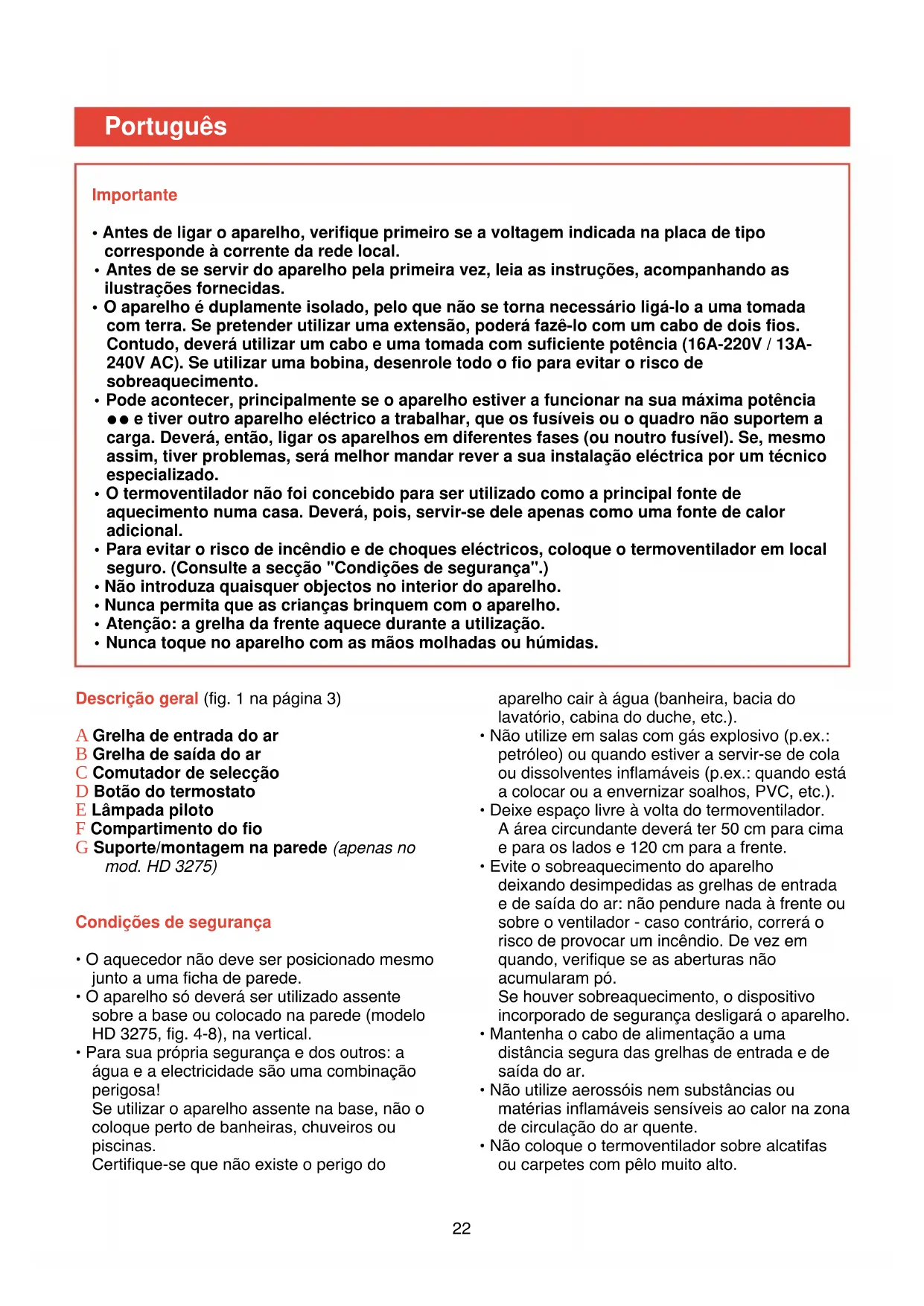 Botão do termostato (D) Com o botão do termostato poderá conseguir uma temperatura constante na sala. Quando o comutador de selecção estiver na posição 1 ou na posição 2, o aparelho liga-se automaticamente (com potência média ou total, respectivamente) logo que a temperatura da sala baixar em relação à temperatura seleccionada. Logo que a temperatura seleccionada for atingida, o aparelho desliga-se. Rode o botão para a esquerda para obter uma temperatura mais elevada ou para a direita se quiser baixar a temperatura. Poderá regular a temperatura durante a utilização. Para encontrar a programação ideal do termostato: - Em primeiro lugar, coloque o botão do termostato na posição máxima. (Rode para a esquerda até parar.) - Logo que a temperatura da sala estiver confortável, rode o botão lentamente, para a direita, até desligar o aparelho. y = Posição "anti-congelamento". Esta posição corresponde à programação mínima do termostato (isto é, aprox. +5ºC) e pode ser utilizada para evitar que as proximidades imediatas do aparelho congelem, ou seja, que os canos fiquem congelados. Coloque o aparelho perto do cano e seleccione esta posição. Nota: Quando utilizar a posição "Ar frio" >, o botão do termostato deve estar no máximo. Lâmpada piloto - Quando o aparelho está ligado à corrente e se põe a trabalhar, seleccionando >, 1 ou 2, a lâmpada piloto (E) acende-se. - A luz manter-se-á até se desligar o aparelho, colocando o selector (C) na posição O ou desligando-o da corrente. - Para indicar que o termoventilador ainda está ligado e a trabalhar nas posições >, 1 ou 2, a lâmpada piloto manter-se-á acesa quando a temperatura seleccionada for atingida e o termostato desligar o aparelho. Pela mesma razão, a lâmpada piloto manter- se-á acesa quando o dispositivo de segurança contra sobreaquecimento desligar o aparelho. Dispositivo de segurança contra sobreaqueicmento Para evitar danos e riscos devidos a sobreaquecimento, o dispositivo de segurança incorporado corta automaticamente a energia logo que as resistências ficam demasiado quentes. Se isso acontecer: - Verifique primeiro se não foi o termostato que desligou o aparelho. Coloque o termostato na posição máxima. Se o aparelho não ligar, é sinal que o dispositivo de segurança foi accionado. - Retire a ficha da tomada de corrente. - Deixe o aparelho arrefecer durante 30 minutos. - Certifique-se que o aparelho está correctamente colocado. - Verifique se nada está a obstruir o fluxo de ar. Se necessário, limpe as grelhas com um aspirador. - Volte a colocar a ficha na tomada e volte a ligar o aparelho. Se o dispositivo de segurança voltar a desligar o aparelho: - Retire a ficha da tomada de corrente. - Leve o aparelho a um Centro de Assistência Philips ou a um seu concessionário. Limpeza - Coloque o comutador de selecção (C) na posição O para desligar o aparelho. - Retire a ficha da tomada de corrente. - Deixe o termoventilador arrefecer por completo. - Poderá limpar o exterior do aparelho com um pano húmido. Não deixe entrar água para dentro do aparelho. - Limpe as grelhas de entrada e de saída do ar com regularidade (numa utilização normal, pelo menos duas vezes por ano) com um aspirador e o bocal de escova.25 Generel beskrivelse (fig. 1 på side 3). A Luftindtag B Luftudblæsning C Omskifterknap D Termostatknap E Kontrollampe F Opbevaring af ledningen G Støtte/vægbeslag (kun type HD 3275) Sikker placering af varmeblæseren.