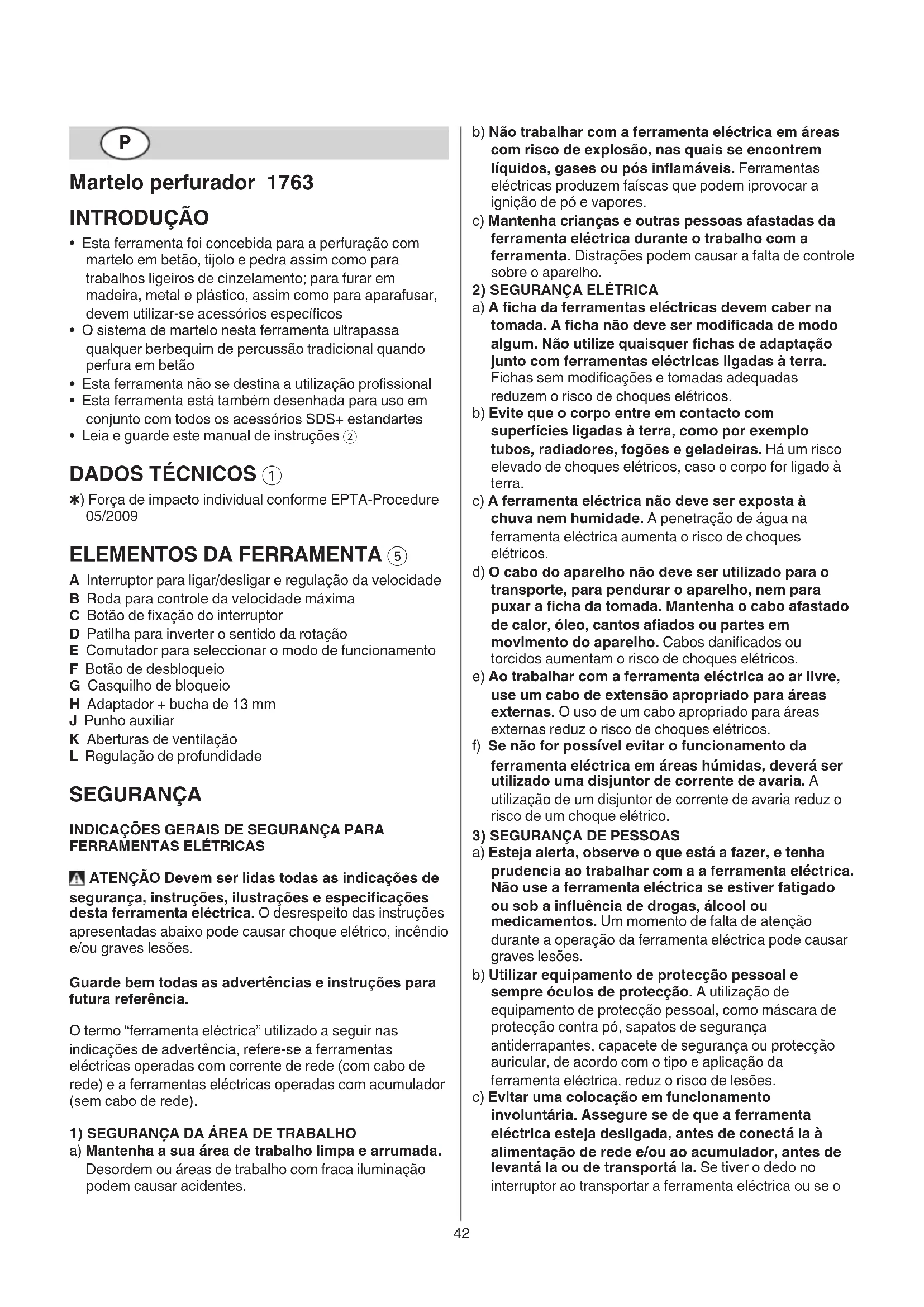 A Interruptor para ligar/desligar e regulação da velocidade B Roda para controle da velocidade máxima C Botão de xação do interruptor D Patilha para inverter o sentido da rotação E Comutador para seleccionar o modo de funcionamento F Botão de desbloqueio G Casquilho de bloqueio H Adaptador + bucha de 13 mm J Punho auxiliar K Aberturas de ventilação L Regulação de profundidade SEGURANÇA INDICAÇÕES GERAIS DE SEGURANÇA PARA