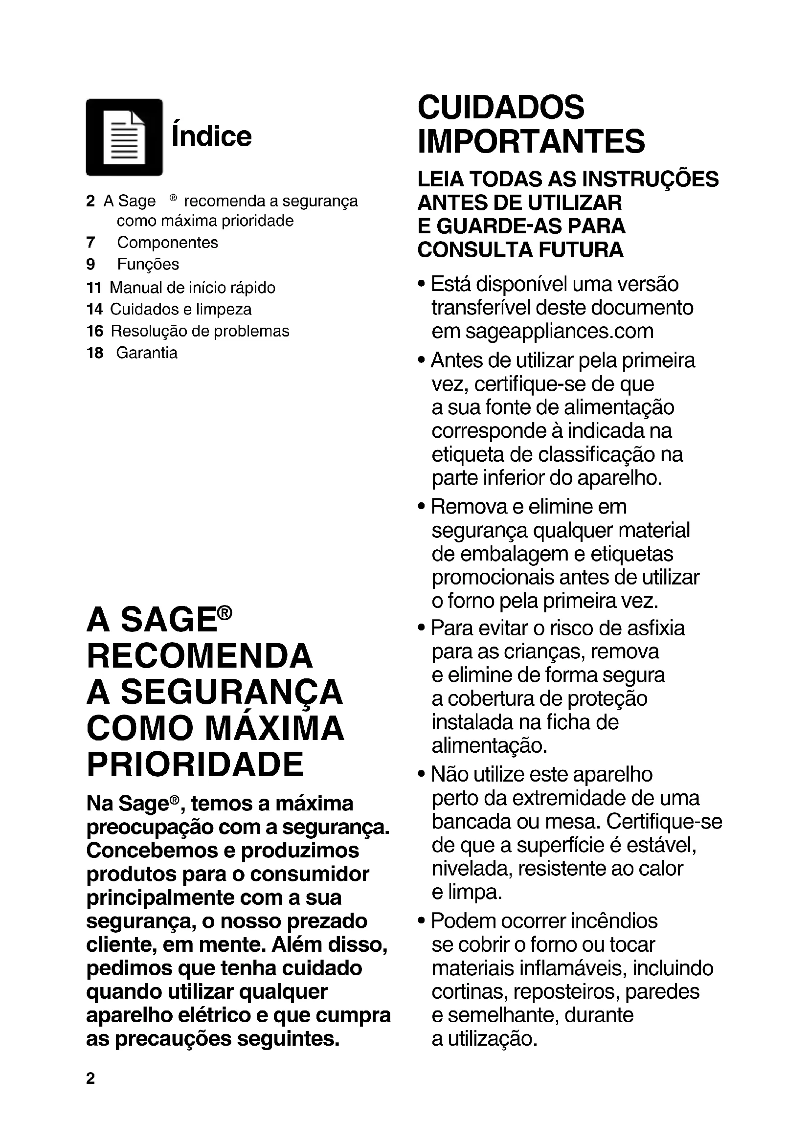 , temos a máxima preocupação com a segurança. Concebemos e produzimos produtos para o consumidor principalmente com a sua segurança, o nosso prezado cliente, em mente. Além disso, pedimos que tenha cuidado quando utilizar qualquer aparelho elétrico e que cumpra as precauções seguintes. 2 A Sage recomenda a segurança como máxima prioridade7 Componentes9 Funções11 Manual de início rápido14 Cuidados e limpeza16 Resolução de problemas18 Garantia3
