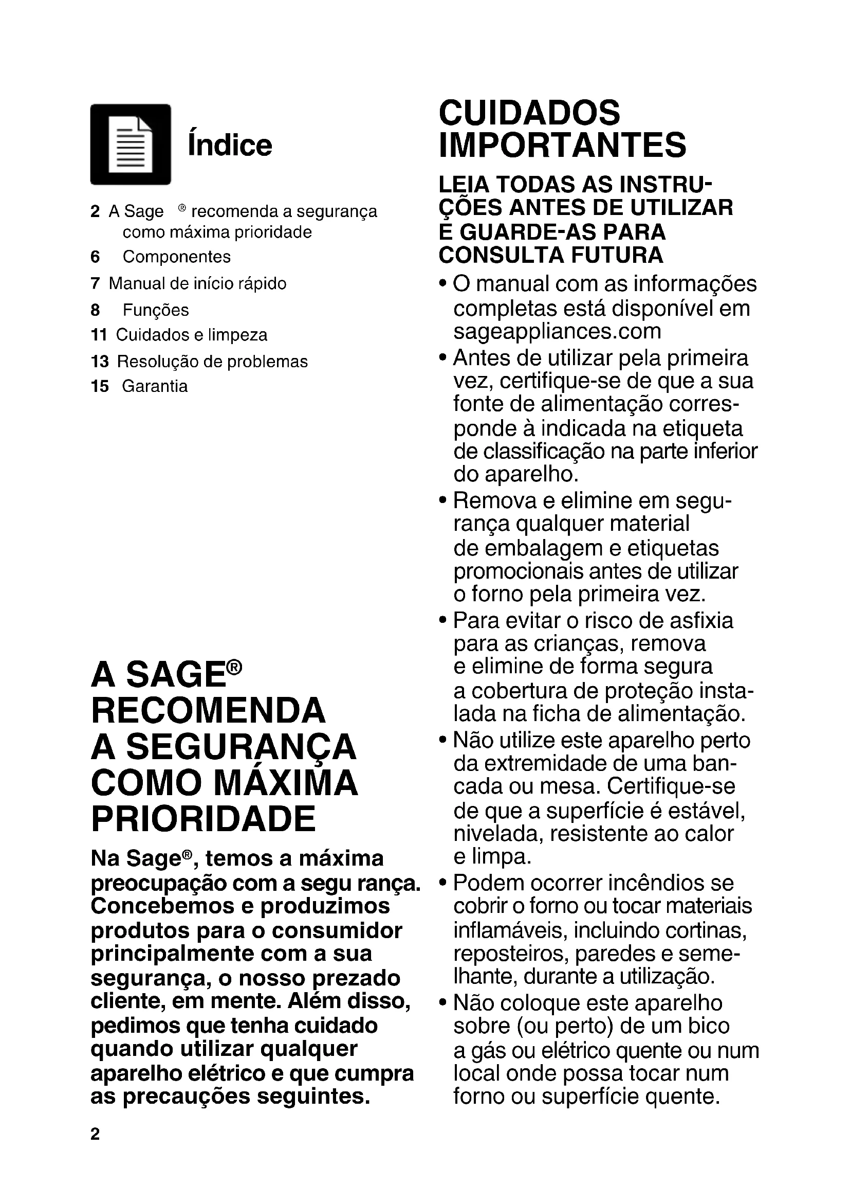 , temos a máxima preocupação com a segu rança. Concebemos e produzimos produtos para o consumidor principalmente com a sua segurança, o nosso prezado cliente, em mente. Além disso, pedimos que tenha cuidado quando utilizar qualquer aparelho elétrico e que cumpra as precauções seguintes. 2 A Sage recomenda a segurança como máxima prioridade6 Componentes7 Manual de início rápido8 Funções11 Cuidados e limpeza13 Resolução de problemas15 Garantia3