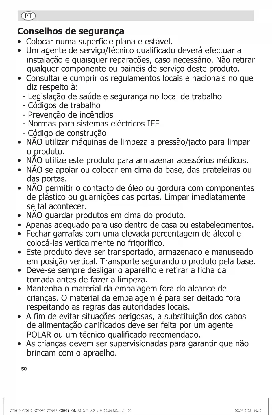 - Aviso: Não use aparelhos eléctricos no interior dos compartimentos de armazenamento de alimentos do aparelho, a menos que eles são o tipo recomendado pelo fabricante. Descrição do produto CD610 - Frigorífico de 150 litros CD611 - Congelador de 140 litros CD612 - Frigorífico de 400 litros CD613 - Congelador de 365 litros CD614 - Frigorífico de 600 litros CD615 - Congelador de 600 litros CD086 - Frigorífico de 150 litros com porta de vidro CD080 - Frigorífico de 150 litros inoxidável CD081 - Congelador de 140 litros inoxidável CD082 - Frigorífico de 400 litros inoxidável CD083 - Congelador de 365 litros inoxidável CD084 - Frigorífico de 600 litros inoxidável CD085 - Congelador de 600 litros inoxidável CD087 - Frigorífico de 400 litros com porta de vidro CD088 - Frigorífico de 600 litros com porta de vidro CB921 - Congelador de 365 litros com porta de vidro GL185 - Frigorífico de 522 litros para produtos de panificação Introdução Por favor utilize o tempo necessário para ler atentamente este manual. Uma manutenção e utilização correcta deste aparelho permitem a melhor capacidade de funcionamento do seu produto POLAR. CD610-CD615_CD080-CD088_CB921_GL185_ML_A5_v19_20201222.indb 51CD610-CD615_CD080-CD088_CB921_GL185_ML_A5_v19_20201222.indb 51 2020/12/22 10:152020/12/22 10:1552