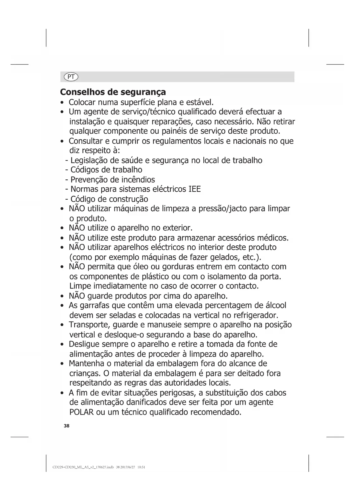 - A fim de evitar situações perigosas, a substituição dos cabos de alimentação danificados deve ser feita por um agente POLAR ou um técnico qualificado recomendado. CD229-CD230_ML_A5_v2_170627.indb 38 2017/6/27 10:5139