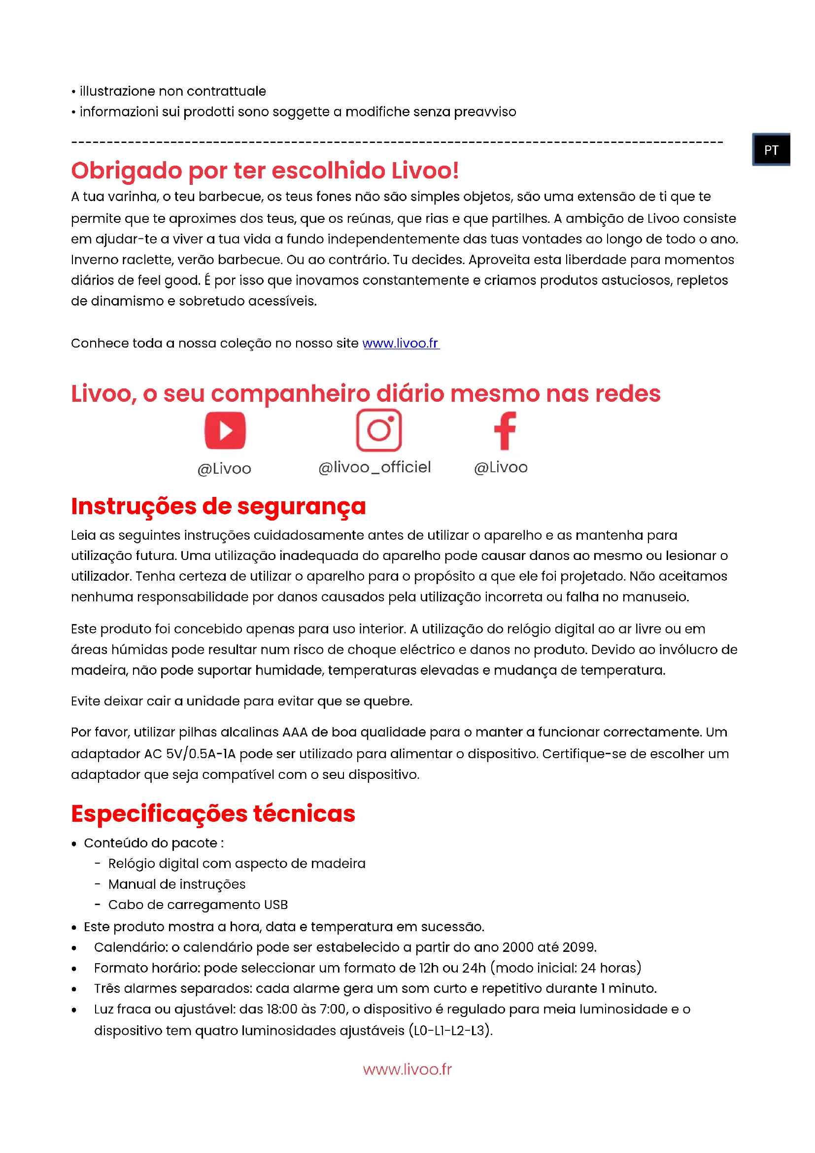 Obrigado por ter escolhido Livoo! A tua varinha, o teu barbecue, os teus fones não são simples objetos, são uma extensão de ti que te permite que te aproximes dos teus, que os reúnas, que rias e que partilhes. A ambição de Livoo consiste em ajudar-te a viver a tua vida a fundo independentemente das tuas vontades ao longo de todo o ano. Inverno raclette, verão barbecue. Ou ao contrário. Tu decides. Aproveita esta liberdade para momentos diários de feel good. É por isso que inovamos constantemente e criamos produtos astuciosos, repletos de dinamismo e sobretudo acessíveis. Conhece toda a nossa coleção no nosso site www.livoo.fr Livoo, o seu companheiro diário mesmo nas redes