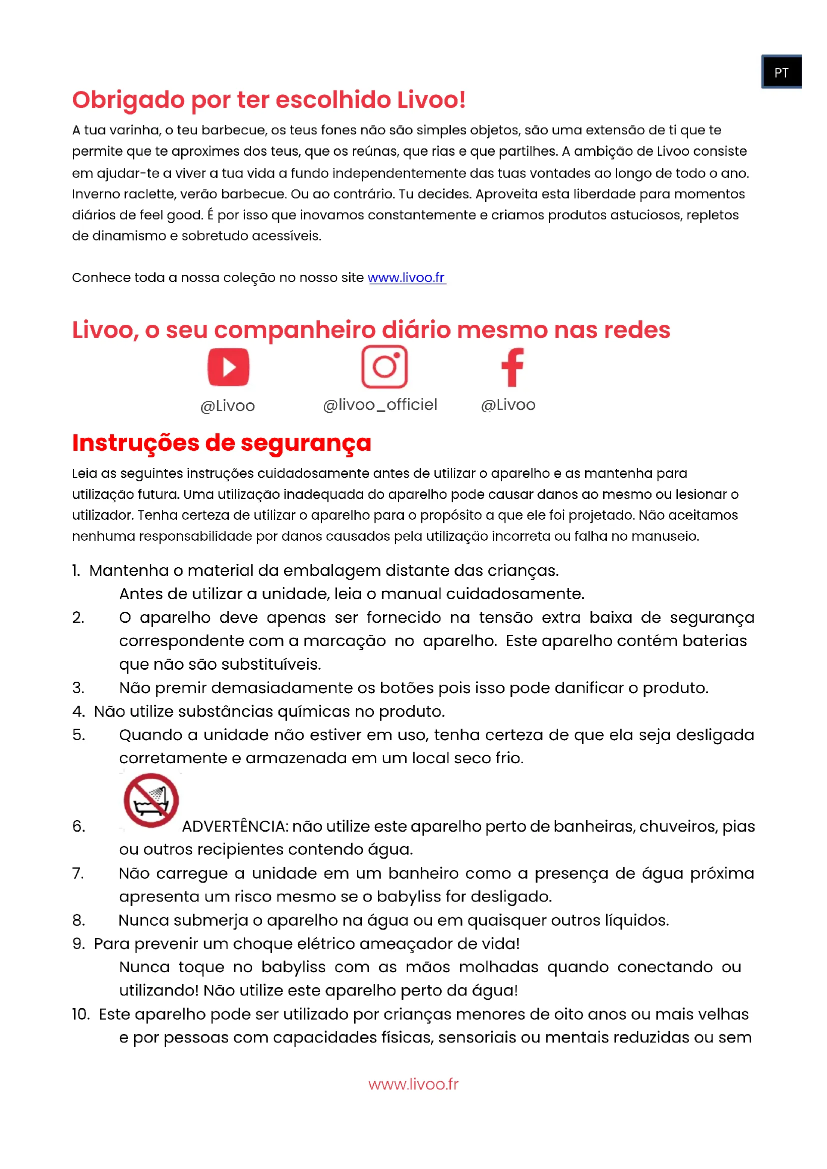 ITwww.livoo.fr Obrigado por ter escolhido Livoo! A tua varinha, o teu barbecue, os teus fones não são simples objetos, são uma extensão de ti que te permite que te aproximes dos teus, que os reúnas, que rias e que partilhes. A ambição de Livoo consiste em ajudar-te a viver a tua vida a fundo independentemente das tuas vontades ao longo de todo o ano. Inverno raclette, verão barbecue. Ou ao contrário. Tu decides. Aproveita esta liberdade para momentos diários de feel good. É por isso que inovamos constantemente e criamos produtos astuciosos, repletos de dinamismo e sobretudo acessíveis. Conhece toda a nossa coleção no nosso site www.livoo.fr Livoo, o seu companheiro diário mesmo nas redes