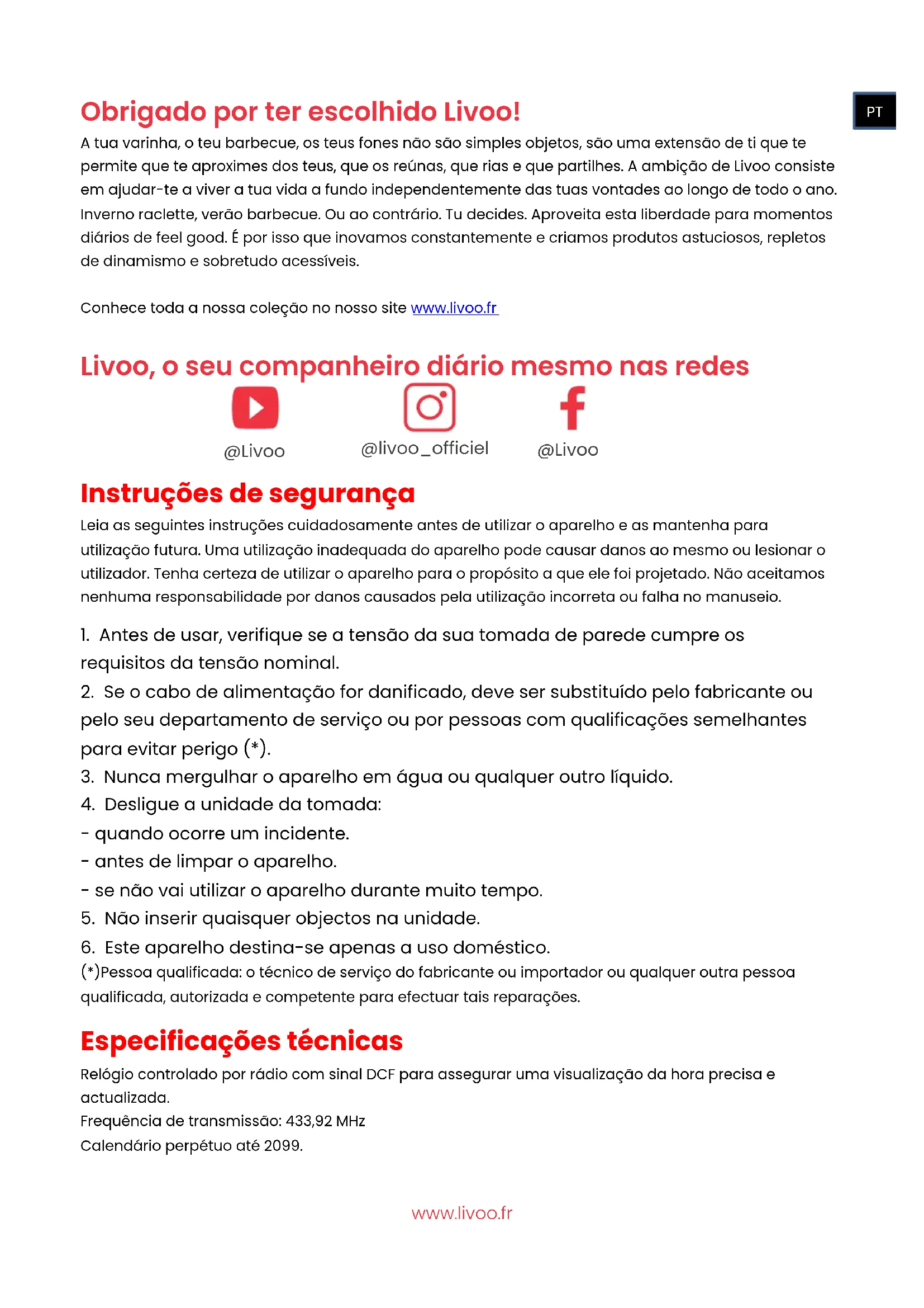 - informazioni sui prodotti sono soggette a modifiche senza preavvisowww.livoo.fr Obrigado por ter escolhido Livoo! A tua varinha, o teu barbecue, os teus fones não são simples objetos, são uma extensão de ti que te permite que te aproximes dos teus, que os reúnas, que rias e que partilhes. A ambição de Livoo consiste em ajudar-te a viver a tua vida a fundo independentemente das tuas vontades ao longo de todo o ano. Inverno raclette, verão barbecue. Ou ao contrário. Tu decides. Aproveita esta liberdade para momentos diários de feel good. É por isso que inovamos constantemente e criamos produtos astuciosos, repletos de dinamismo e sobretudo acessíveis. Conhece toda a nossa coleção no nosso site www.livoo.fr Livoo, o seu companheiro diário mesmo nas redes