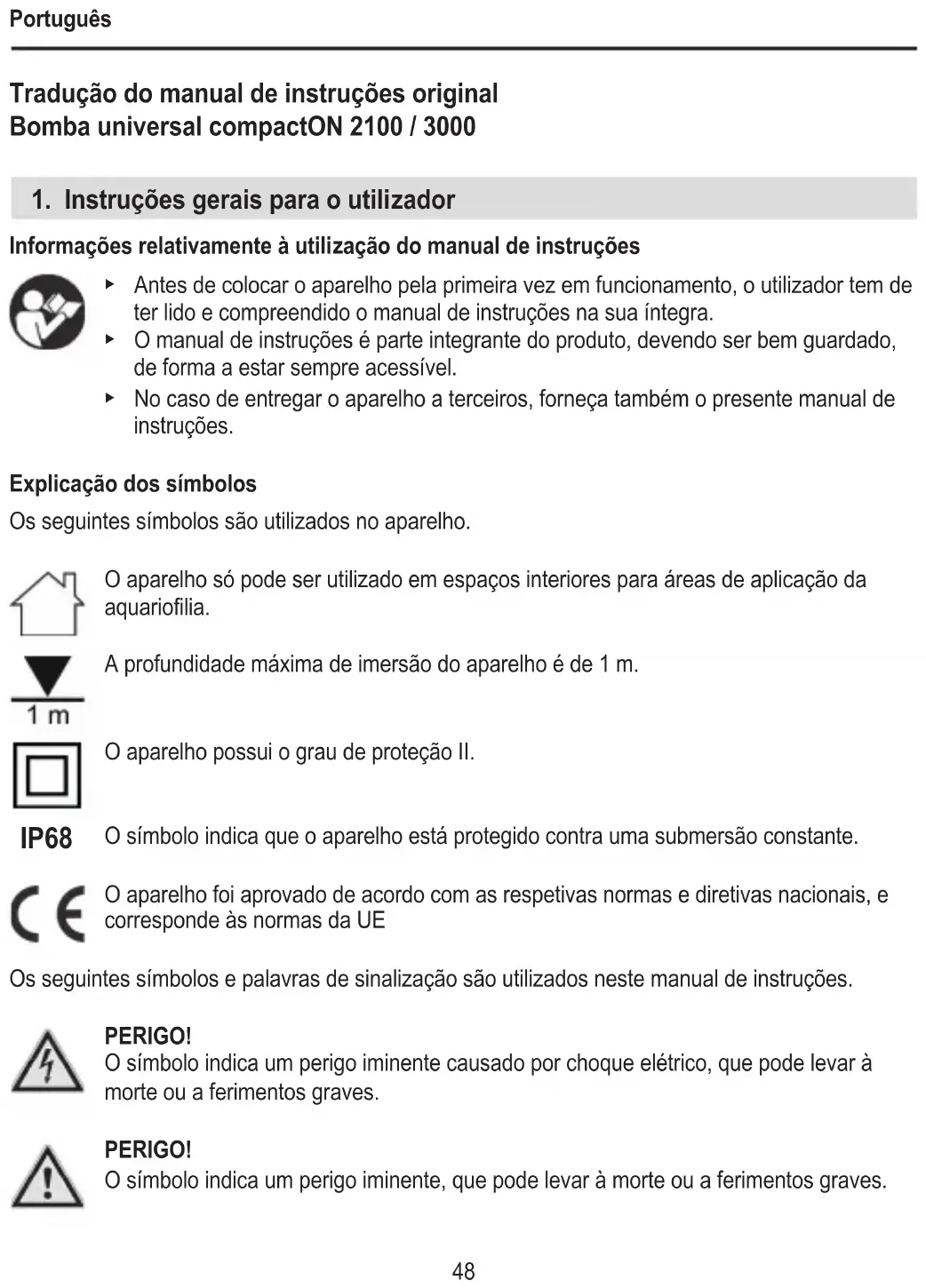 Informações relativamente à utilização do manual de instruções ▶ Antes de colocar o aparelho pela primeira vez em funcionamento, o utilizador tem de ter lido e compreendido o manual de instruções na sua íntegra. ▶ O manual de instruções é parte integrante do produto, devendo ser bem guardado, de forma a estar sempre acessível. ▶ No caso de entregar o aparelho a terceiros, forneça também o presente manual de instruções. Explicação dos símbolos Os seguintes símbolos são utilizados no aparelho. O aparelho só pode ser utilizado em espaços interiores para áreas de aplicação da aquariolia. A profundidade máxima de imersão do aparelho é de 1 m. O aparelho possui o grau de proteção II. O símbolo indica que o aparelho está protegido contra uma submersão constante. O aparelho foi aprovado de acordo com as respetivas normas e diretivas nacionais, e corresponde às normas da UE Os seguintes símbolos e palavras de sinalização são utilizados neste manual de instruções. PERIGO! O símbolo indica um perigo iminente causado por choque elétrico, que pode levar à morte ou a ferimentos graves. PERIGO! O símbolo indica um perigo iminente, que pode levar à morte ou a ferimentos graves. IP68Português