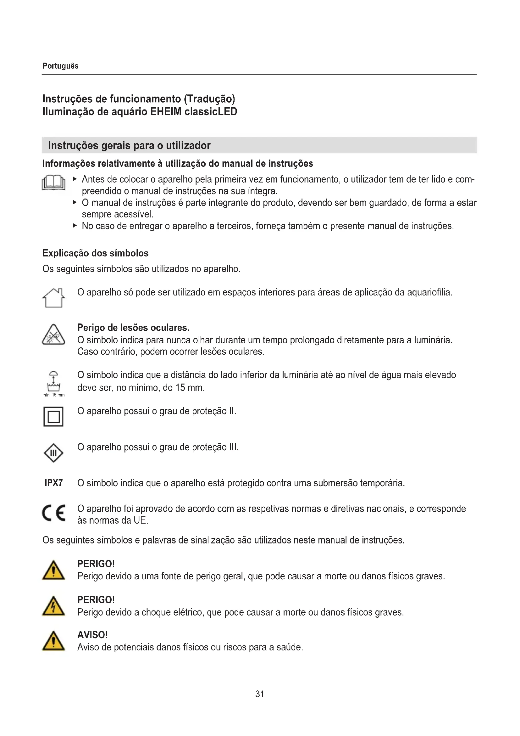 preendido o manual de instruções na sua íntegra. ▶ O manual de instruções é parte integrante do produto, devendo ser bem guardado, de forma a estar sempre acessível. ▶ No caso de entregar o aparelho a terceiros, forneça também o presente manual de instruções. Explicação dos símbolos Os seguintes símbolos são utilizados no aparelho. O aparelho só pode ser utilizado em espaços interiores para áreas de aplicação da aquariolia. Perigo de lesões oculares. O símbolo indica para nunca olhar durante um tempo prolongado diretamente para a luminária. Caso contrário, podem ocorrer lesões oculares. O símbolo indica que a distância do lado inferior da luminária até ao nível de água mais elevado deve ser, no mínimo, de 15 mm. O aparelho possui o grau de proteção II. O aparelho possui o grau de proteção III. O símbolo indica que o aparelho está protegido contra uma submersão temporária. O aparelho foi aprovado de acordo com as respetivas normas e diretivas nacionais, e corresponde às normas da UE. Os seguintes símbolos e palavras de sinalização são utilizados neste manual de instruções. PERIGO! Perigo devido a uma fonte de perigo geral, que pode causar a morte ou danos físicos graves. PERIGO! Perigo devido a choque elétrico, que pode causar a morte ou danos físicos graves. AVISO! Aviso de potenciais danos físicos ou riscos para a saúde. mín. 15 mm IPX732 Português Âmbito de aplicação O aparelho e todas as peças incluídas no volume de fornecimento destinam-se ao uso privado, podendo exclusivamente ser utilizados da seguinte forma: ‧ Para a iluminação de aquários ‧ em conformidade com os dados técnicos CUIDADO! Aviso de perigo de danos materiais. Indicação com informações e dicas úteis. Informação sobre a apresentação: Referência a uma gura, neste caso, à Figura A. É solicitado a tomar uma medida.