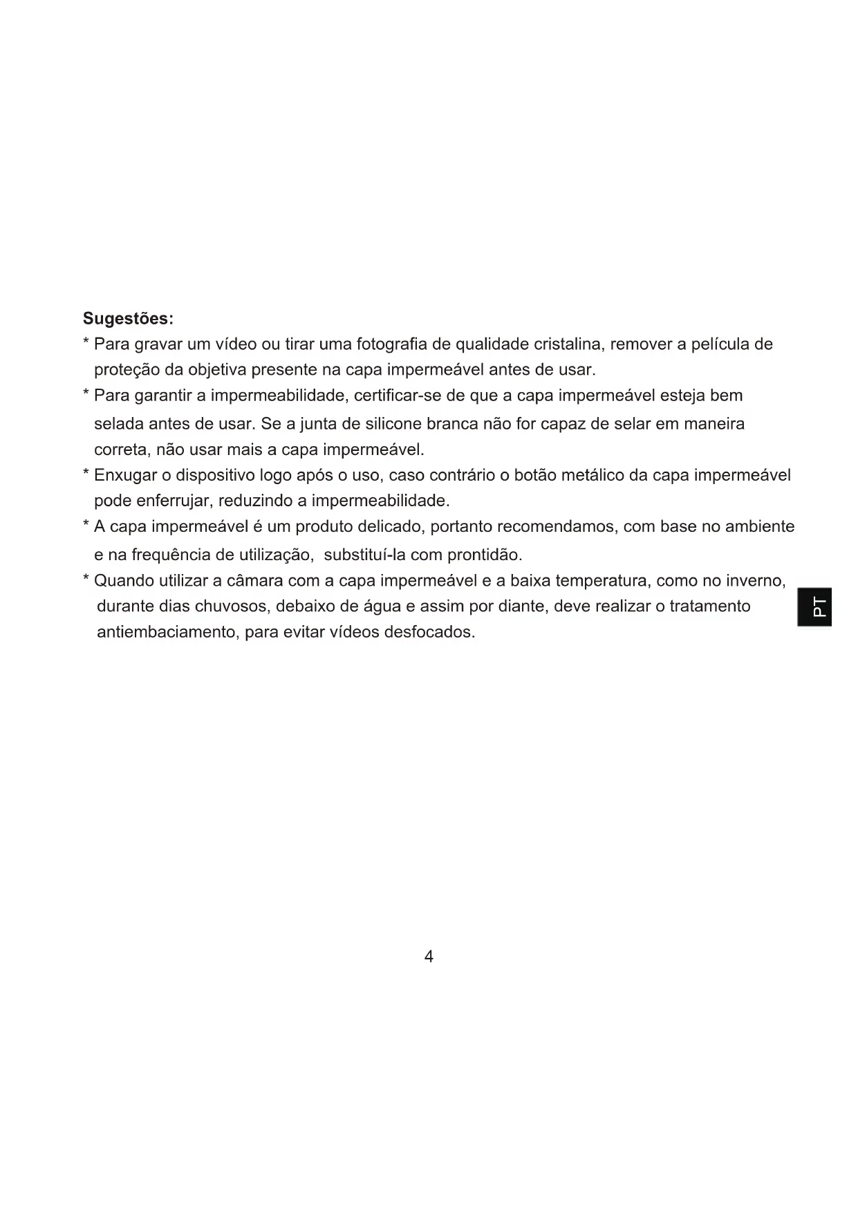 - Quando utilizar a câmara com a capa impermeável e a baixa temperatura, como no inverno, durante dias chuvosos, debaixo de água e assim por diante, deve realizar o tratamento antiembaciamento, para evitar vídeos desfocados.