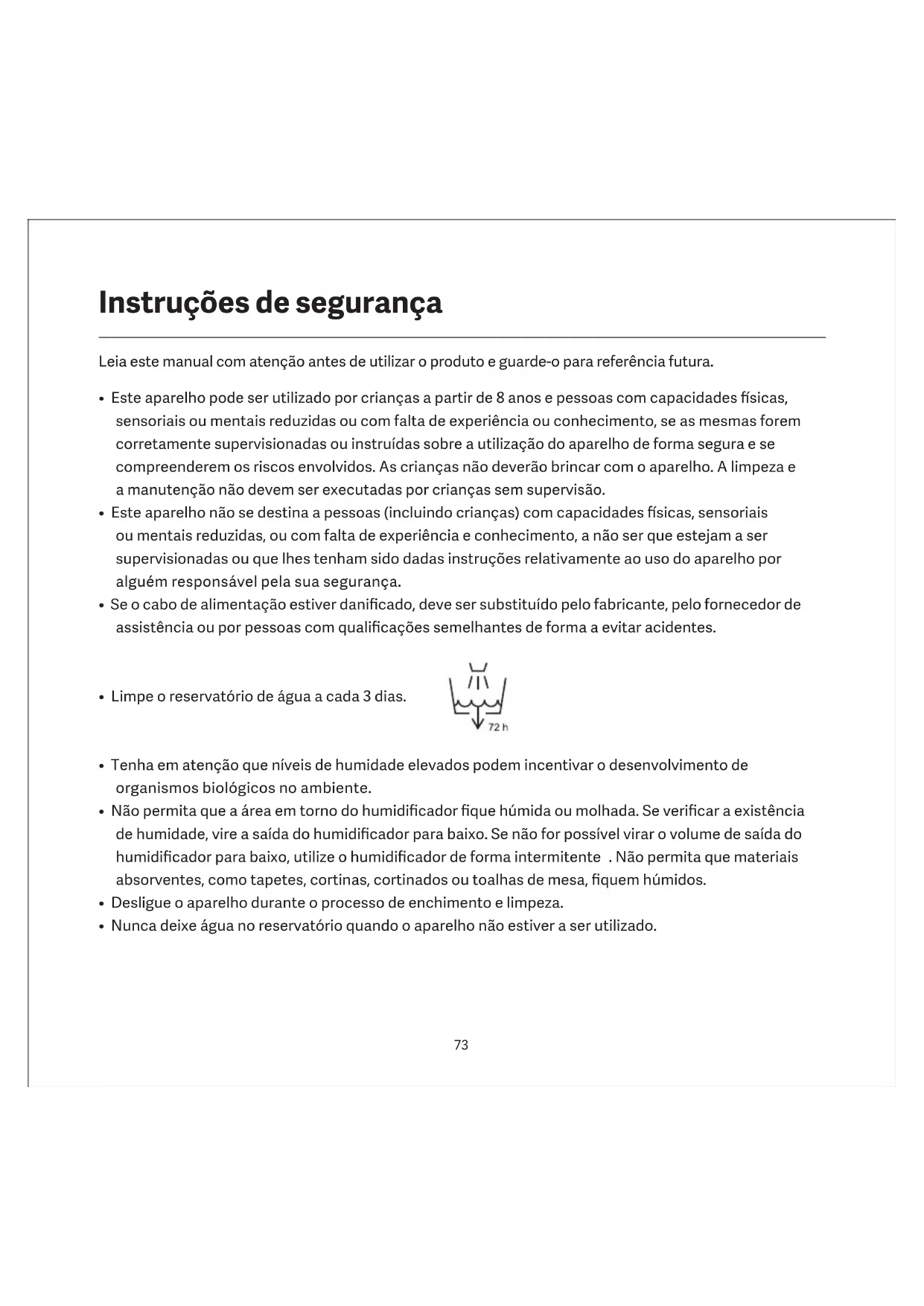 - AVISO: Micro-organismos que possam estar presentes na água ou no ambiente onde o aparelho é utilizado ou armazenado, podem desenvolver-se no reservatório e espalhar-se no ar, provocando riscos de saúde muito graves se a água não for renovada e o reservatório não for devidamente limpo a cada 3dias.