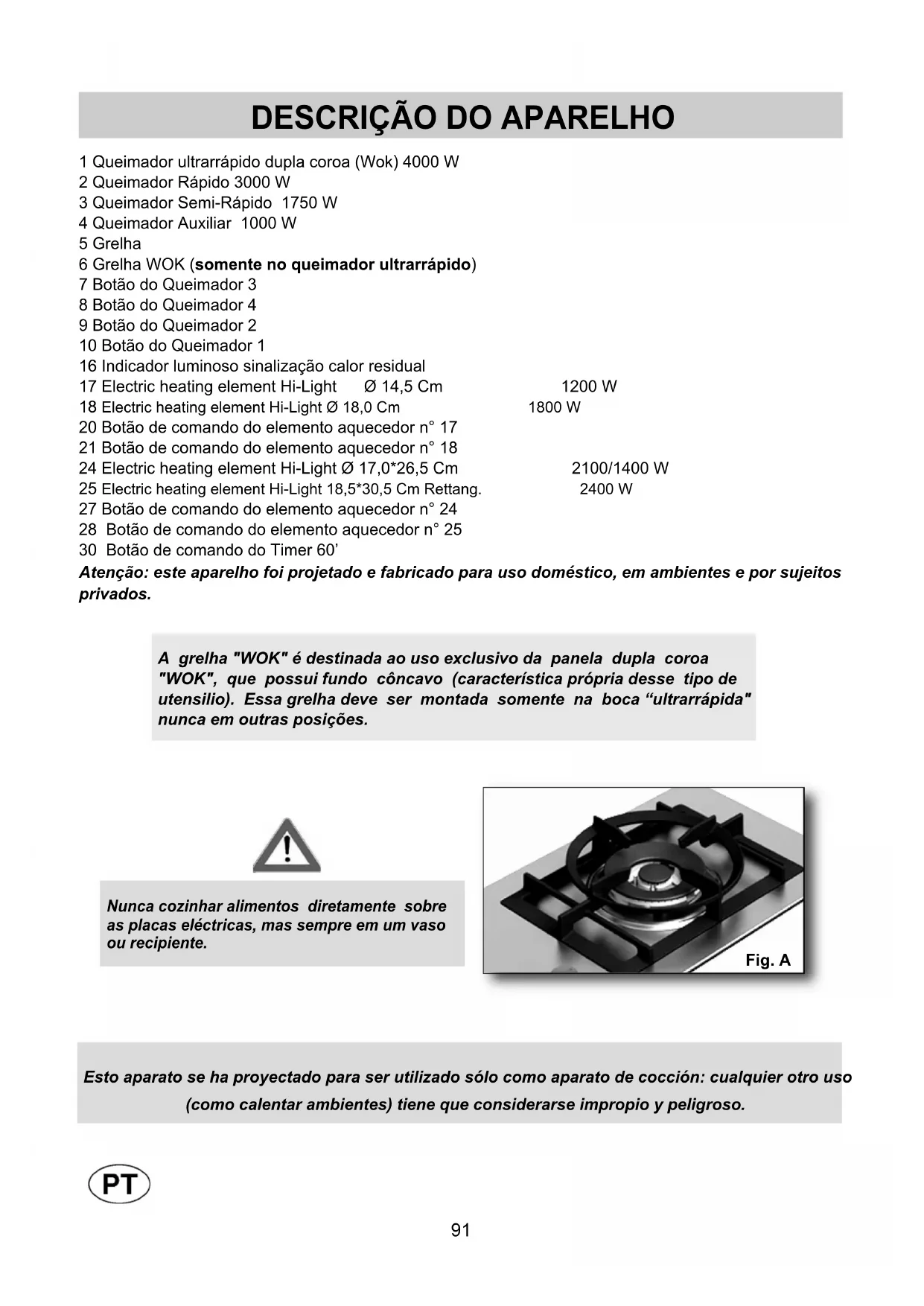 1 Queimador ultrarrápido dupla coroa (Wok) 4000 W 2 Queimador Rápido 3000 W 3 Queimador Semi-Rápido 1750 W 4 Queimador Auxiliar 1000 W 5 Grelha 6 Grelha WOK (somente no queimador ultrarrápido) 7 Botão do Queimador 3 8 Botão do Queimador 4 9 Botão do Queimador 2 10 Botão do Queimador 1 16 Indicador luminoso sinalização calor residual 17 Electric heating element Hi-Light Ø 14,5 Cm 1200 W 18 Electric heating element Hi-Light Ø 18,0 Cm 1800 W 20 Botão de comando do elemento aquecedor n° 17 21 Botão de comando do elemento aquecedor n° 18 24 Electric heating element Hi-Light Ø 17,0*26,5 Cm 2100/1400 W 25 Electric heating element Hi-Light 18,5*30,5 Cm Rettang. 2400 W 27 Botão de comando do elemento aquecedor n° 24 28 Botão de comando do elemento aquecedor n° 25 30 Botão de comando do Timer 60’ Atenção: este aparelho foi projetado e fabricado para uso doméstico, em ambientes e por sujeitos privados.