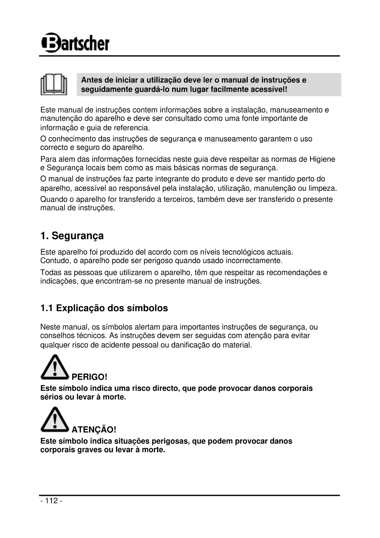 Este manual de instruções contem informações sobre a instalação, manuseamento e manutenção do aparelho e deve ser consultado como uma fonte importante de informação e guia de referencia. O conhecimento das instruções de segurança e manuseamento garantem o uso correcto e seguro do aparelho. Para alem das informações fornecidas neste guia deve respeitar as normas de Higiene e Segurança locais bem como as mais básicas normas de segurança. O manual de instruções faz parte integrante do produto e deve ser mantido perto do aparelho, acessível ao responsável pela instalação, utilização, manutenção ou limpeza. Quando o aparelho for transferido a terceiros, também deve ser transferido o presente manual de instruções.