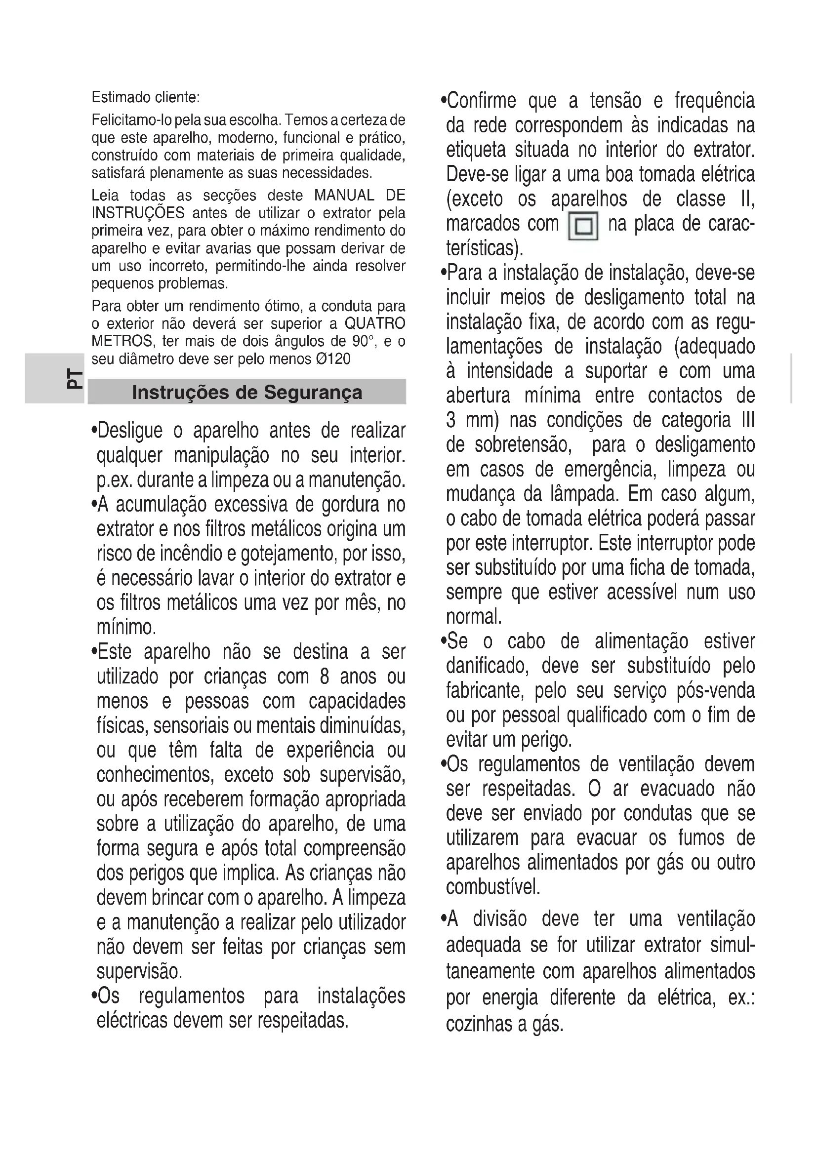 - A divisão deve ter uma ventilação adequada se for utilizar extrator simul- taneamente com aparelhos alimentados por energia diferente da elétrica, ex.: cozinhas a gás. Instruções de SegurançaPT