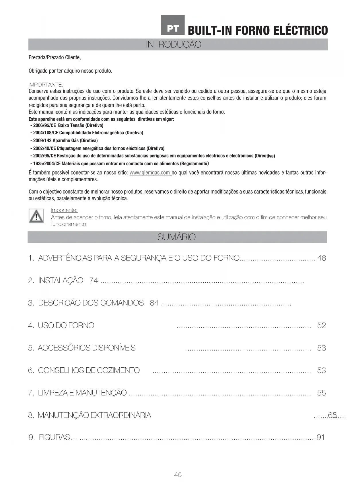 - ADVERTÉNCIAS PARA A SEGURANÇA E O USO DO FORNO 46
