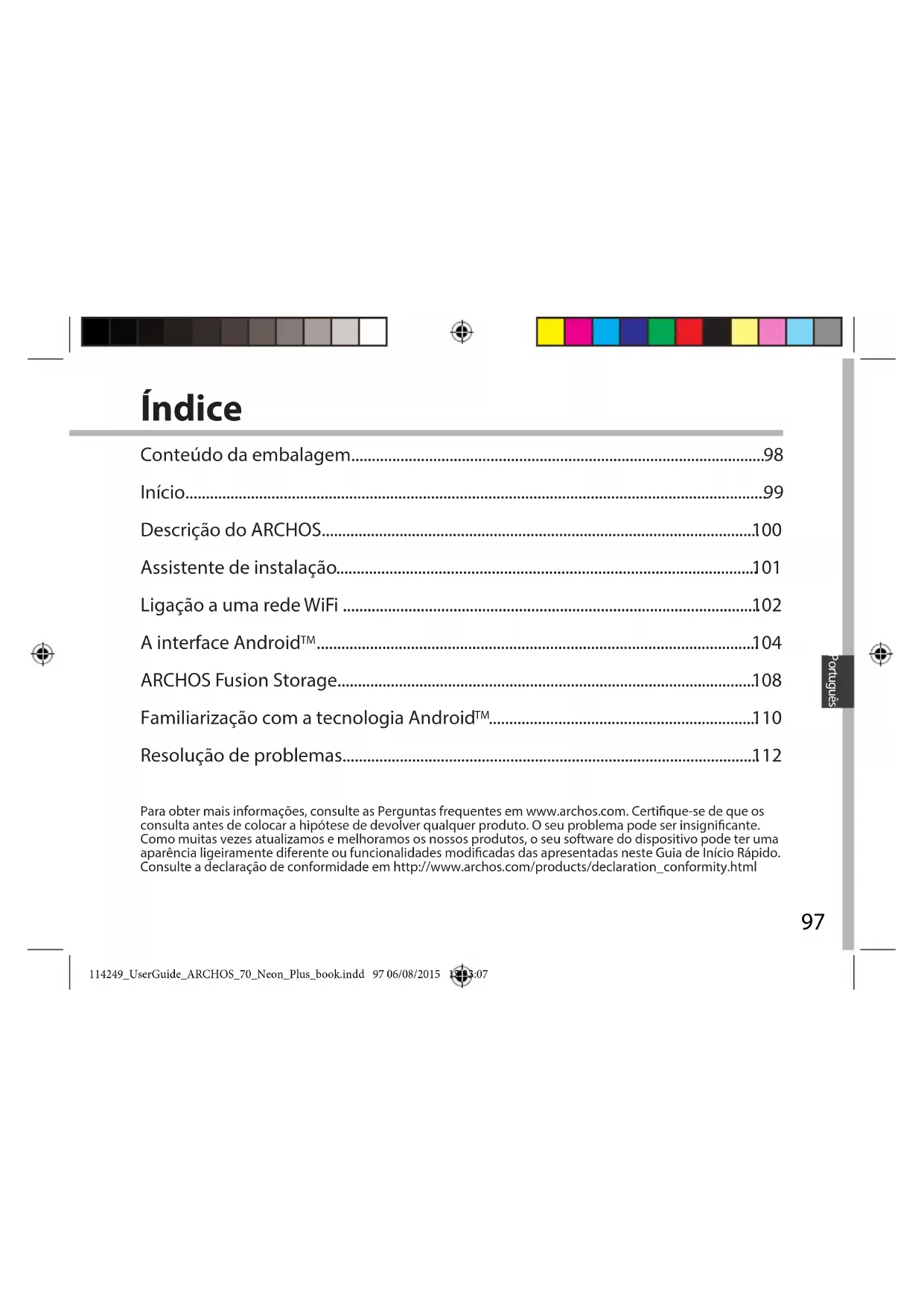 114249_UserGuide_ARCHOS_70_Neon_Plus_book.indd 97 06/08/2015 15:23:0798 Warranty Conteúdo da embalagem Cabo USB Carregador Guia do usuário Garantia, avisos legais e de segurança ARCHOS 70 Neon + 114249_UserGuide_ARCHOS_70_Neon_Plus_book.indd 98 06/08/2015 15:23:0799 Português Início SUGESTÕES: Para receber uma assistência mais completa, registe o seu produto. No caso de um computador, vá a www.archos.com/register. Carregar a bateria